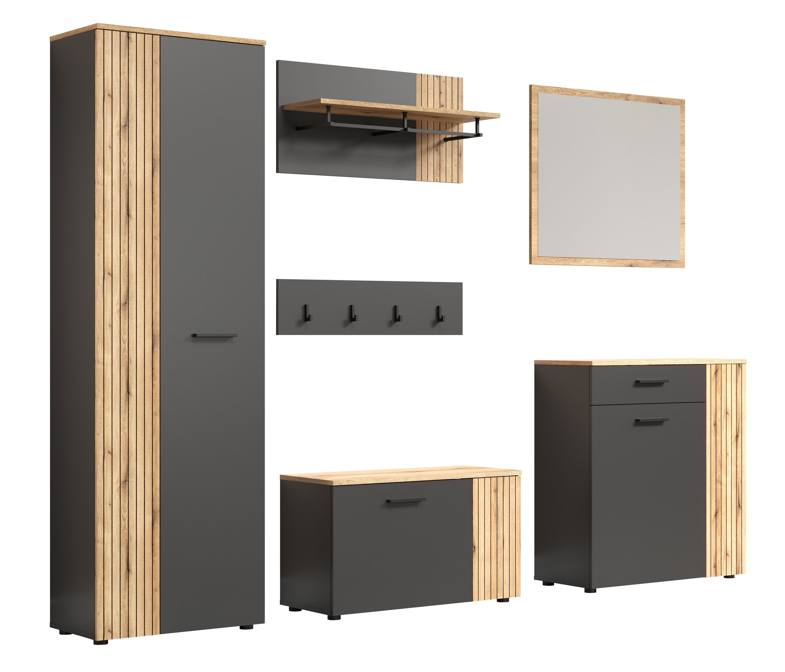 Entdecken Sie das stilvolle Garderobenmöbel-Set, das Funktionalität und modernes Design vereinen. Mit einer Höhe von 195 cm, einer Breite von 250 cm und einer Tiefe von 36 cm bietet dieses Set großzügigen Stauraum für Ihre Kleidung und Accessoires. Der Korpus und die Front in elegantem Anthrazit Melamin sorgen für eine zeitgemäße Optik, während die Absetzung in Coast Evoke Oak Melamin einen warmen, natürlichen Akzent setzt. Die durchdachte Gestaltung umfasst mehrere Türen und Schubladen, in denen Sie Ihre Gegenstände ordentlich verstauen können. Darüber hinaus ist die Verwendung hochwertiger Holzwerkstoffe umweltfreundlich, da das Produkt FSC-zertifiziert ist. Erleben Sie die perfekte Kombination aus Stil und Funktionalität in Ihrem Eingangsbereich oder Flur.