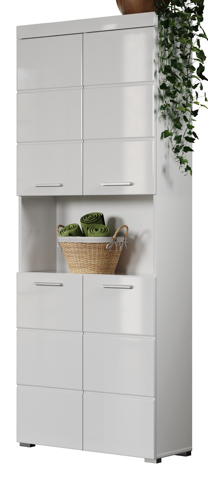 Vier weiße Hochglanz Türen in trendiger Kassetten Optik verleihen dem Badezimmer eine hochwertige und elegante Optik. Dank der leicht aufgelockerten Front wirkt der Hochschranks umso attraktiver.