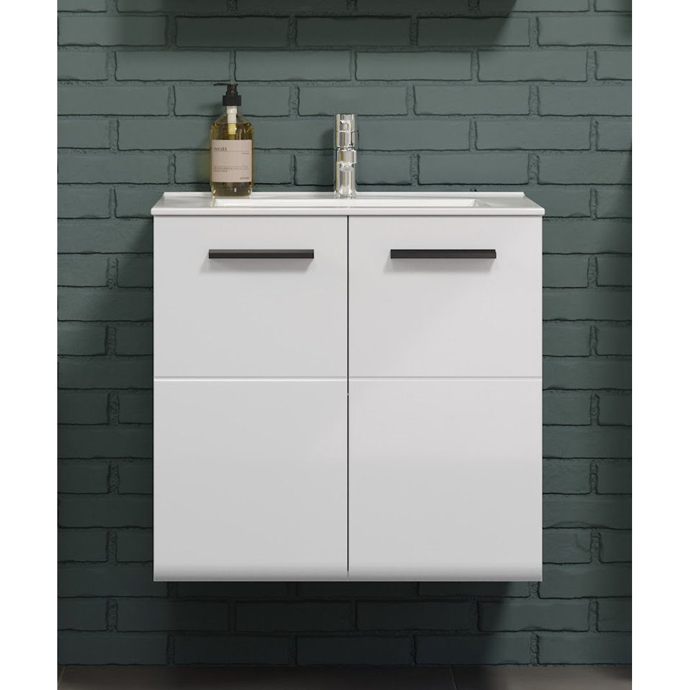 Ausstattung | 2 Türen / 1 Einlegboden / 2 geschlossene Fächer / Keramik-Waschbecken |