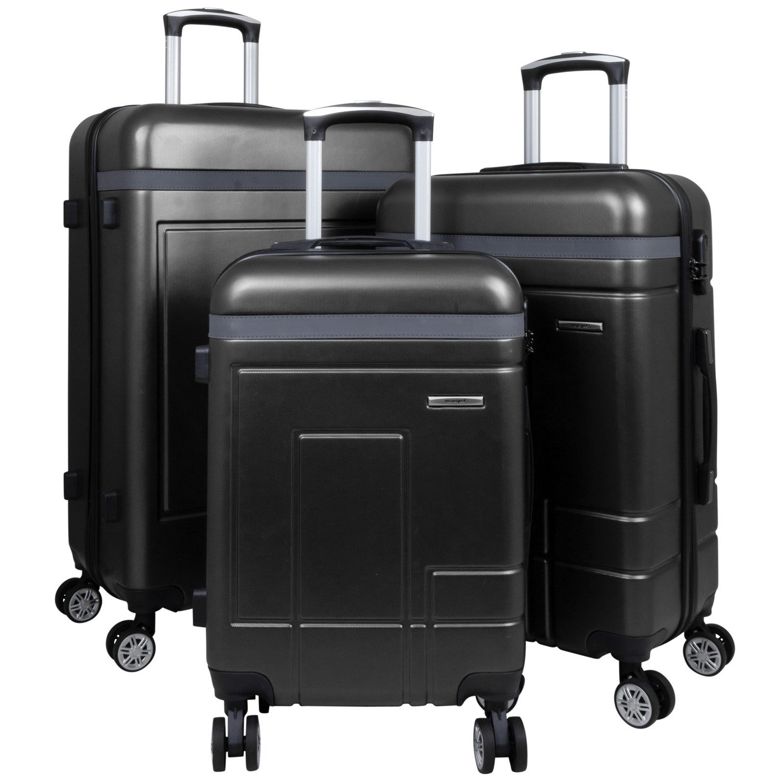 Außenausstattung | 4 Doppelrollen ausziehbarer Teleskopgriff Tragegriff seitlich und oben Hartschalen aus ABS Zahlenschloss seitliche Standfüße |