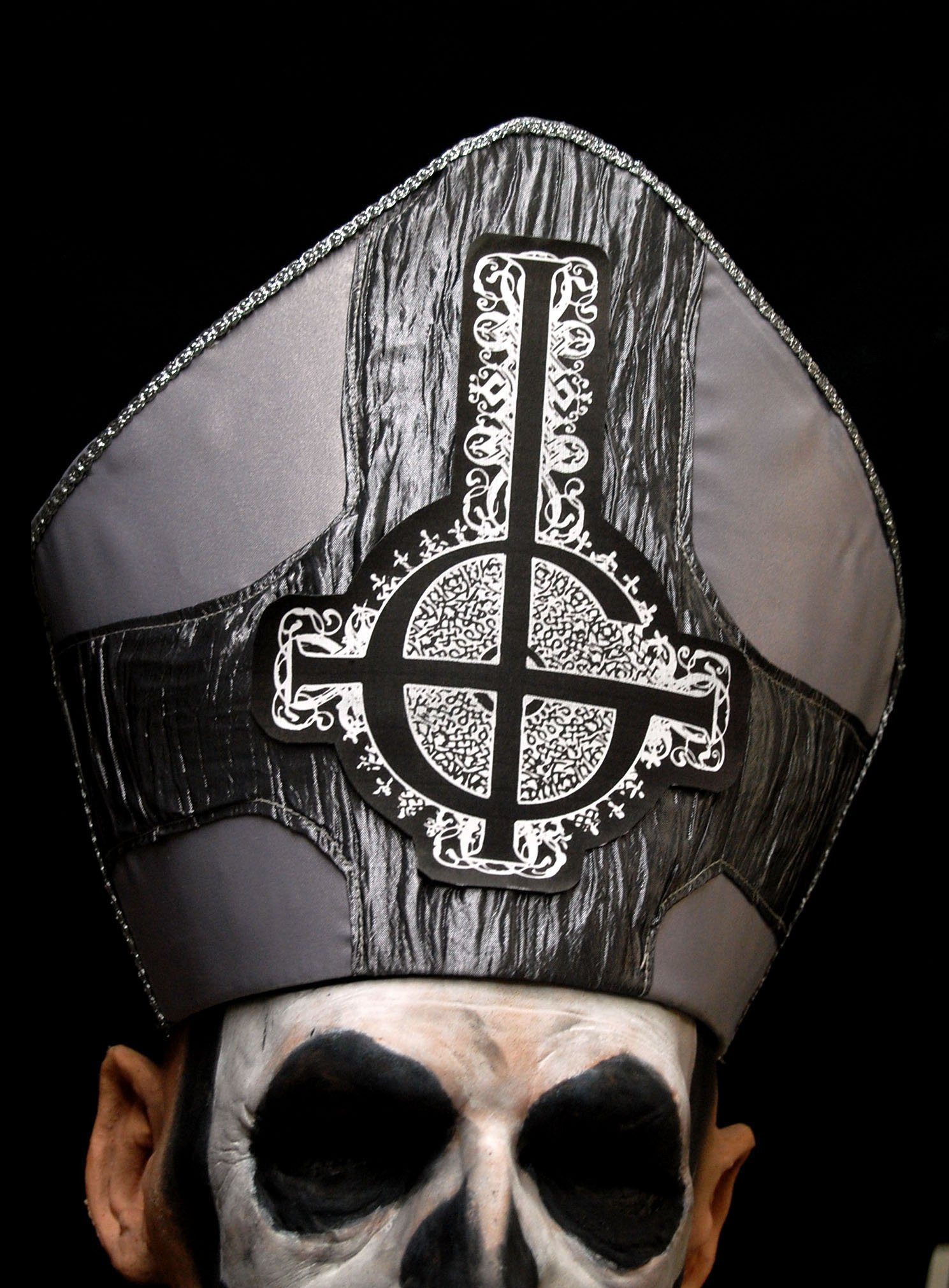 Unsere hochwertige Papa Emeritus II. Mitra steht dem Original in nichts nach. Die hoch aufragende Kopfbedeckung ist innen verstärkt, mit dem Bandlogo verziert und auf der Rückseite mit zwei schwarzen