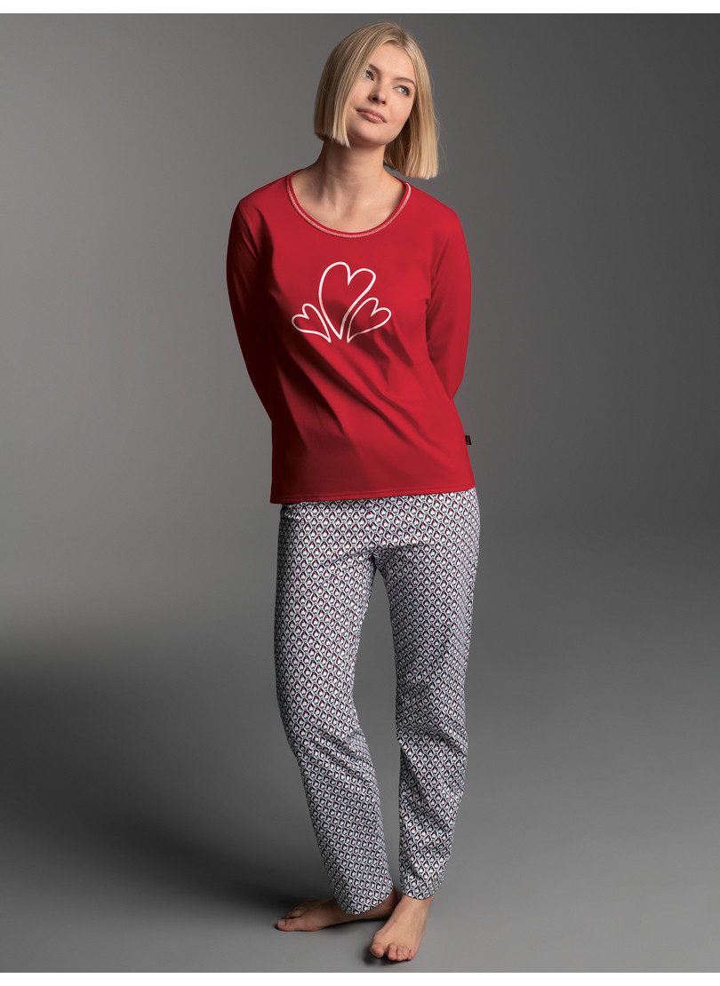 Fühlen Sie sich rundum wohl im exklusiven trigema Damen Pyjama-Set, das mit einem charmanten Herzmotiv auf dem Oberteil liebevolle Akzente setzt. Der verspielte Druck verleiht dem Schlafshirt eine besondere Note und macht es zum stilvollen Hingucker für Ihre Wohlfühlmomente. Kombiniert wird das Oberteil mit einer langen Pyjamahose, die mit einem modernen Allover-Pinguinmuster begeistert. Das Zusammenspiel aus romantischem Herzdesign und originellem Pinguinprint verleiht diesem Schlafanzug-Set seinen einzigartigen Charakter. Ob für entspannte Stunden auf dem Sofa, beim Lesen oder beim Ausschlafen am Wochenende – das weiche Material und die bequeme Passform sorgen für ein angenehmes Hautgefühl und maximale Bewegungsfreiheit. Vertrauen Sie auf bewährte trigema Qualität "Made in Germany" und genießen Sie stilvollen Komfort in jeder Nacht.