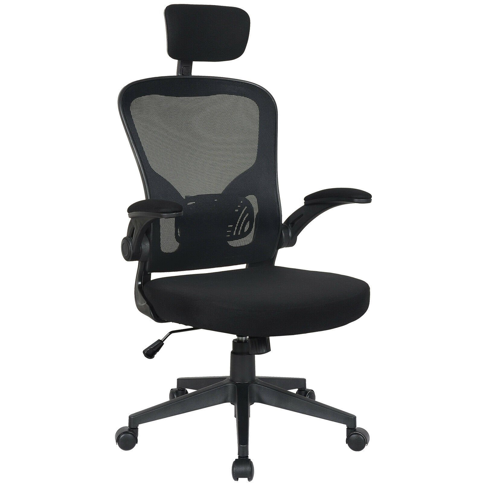 Die Armlehnen des Chefsessels können hochgeklappt werden. Wahlweise kommt der Stuhl mit einer Kopfstütze oder ohne Kopfstütze. Mit dem Hebel lässt sich die Sitzhöhe stufenlos einstellen. Auch eine Wippfunktion ist dabei. Der Rücken wird durch eine spezielle Stütze in ergonomischer Position gehalten.