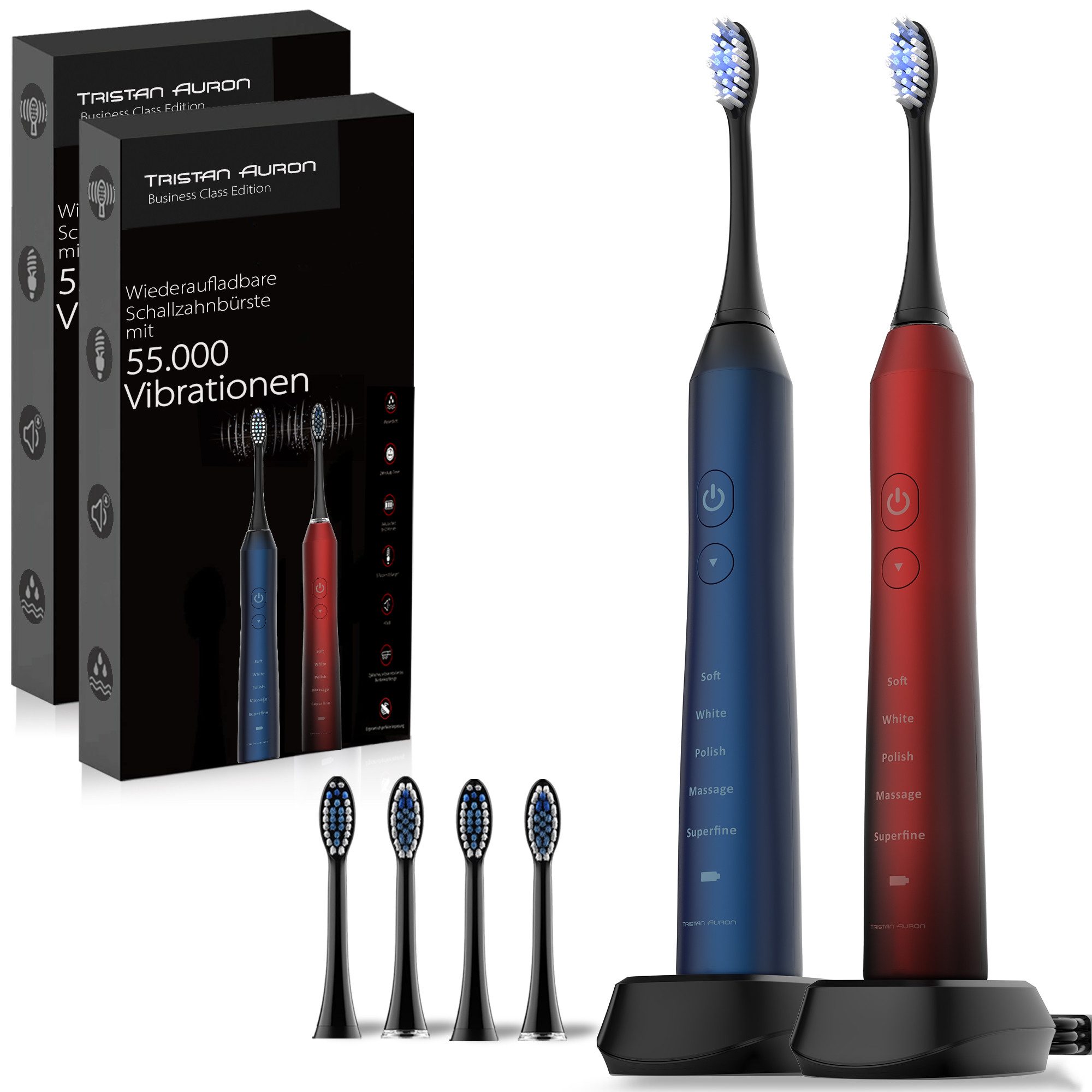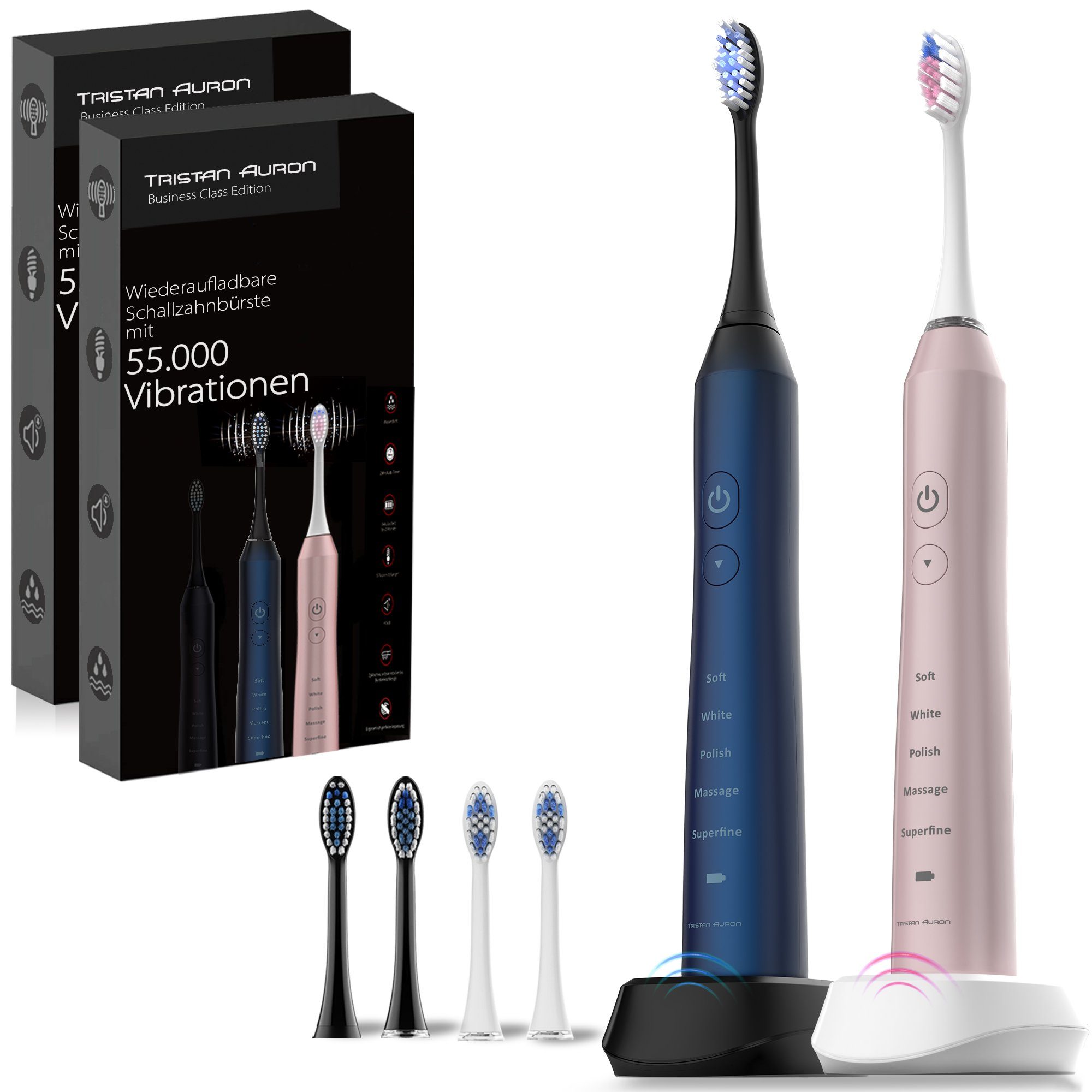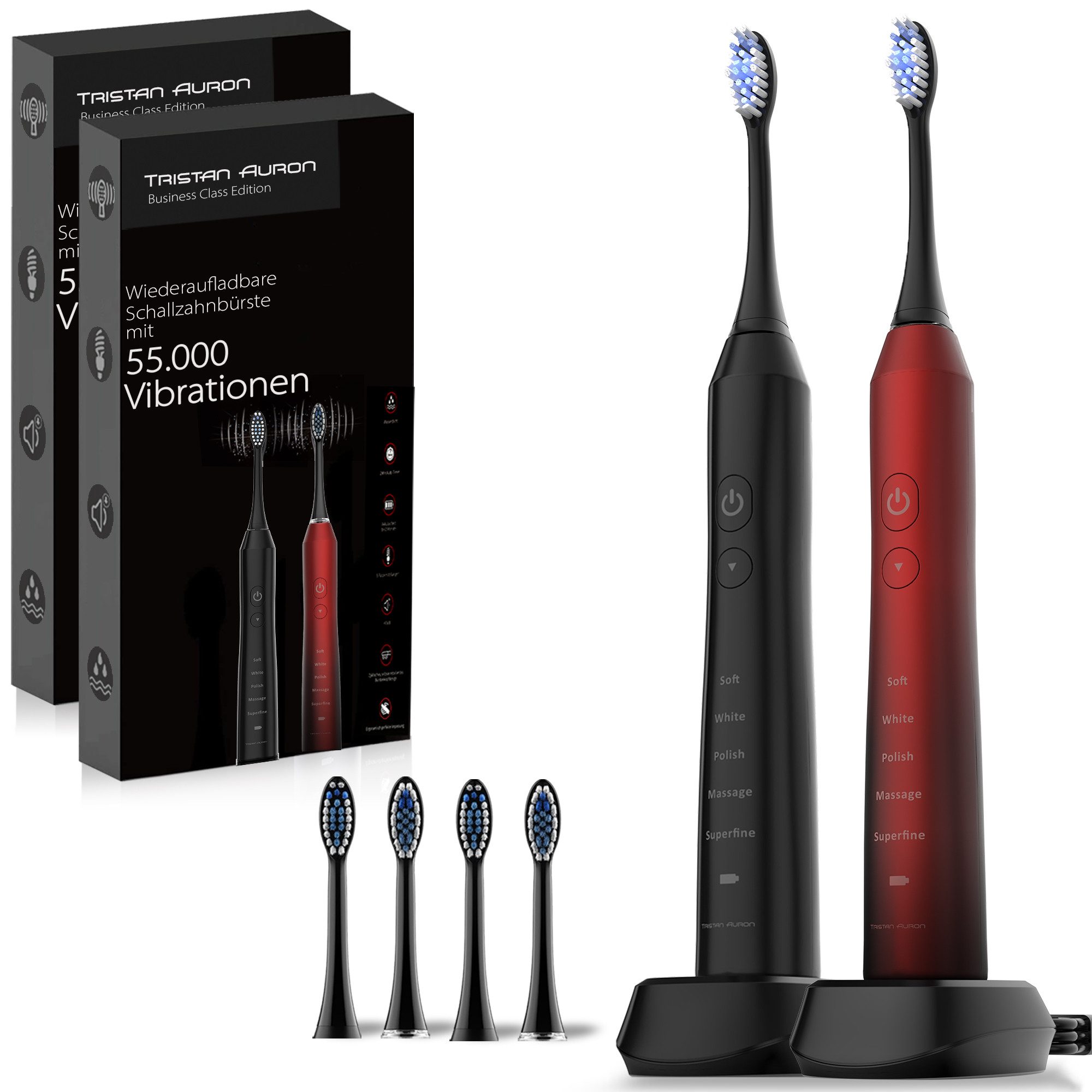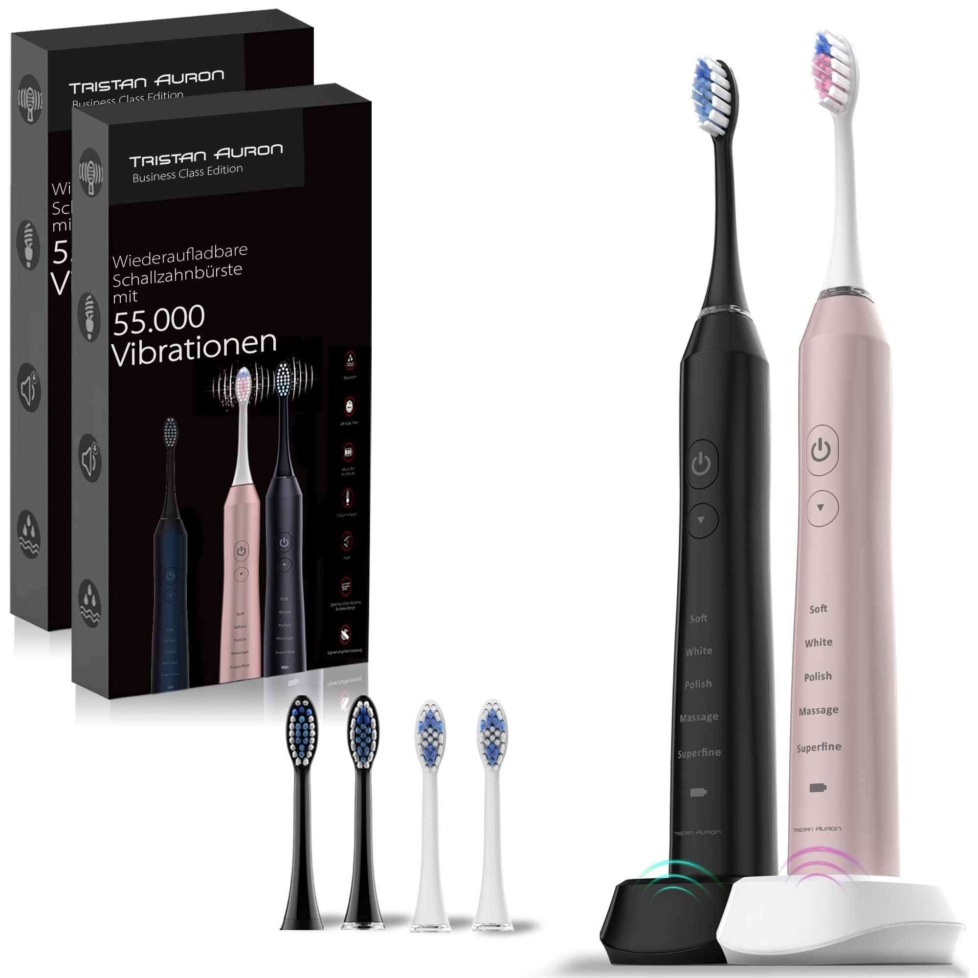 Lieferumfang | 2x elektrische Schallzahnbürste, 4x Professional Aufsteckbürsten, 2x Induktion Ladestation mit USB Anschluss |