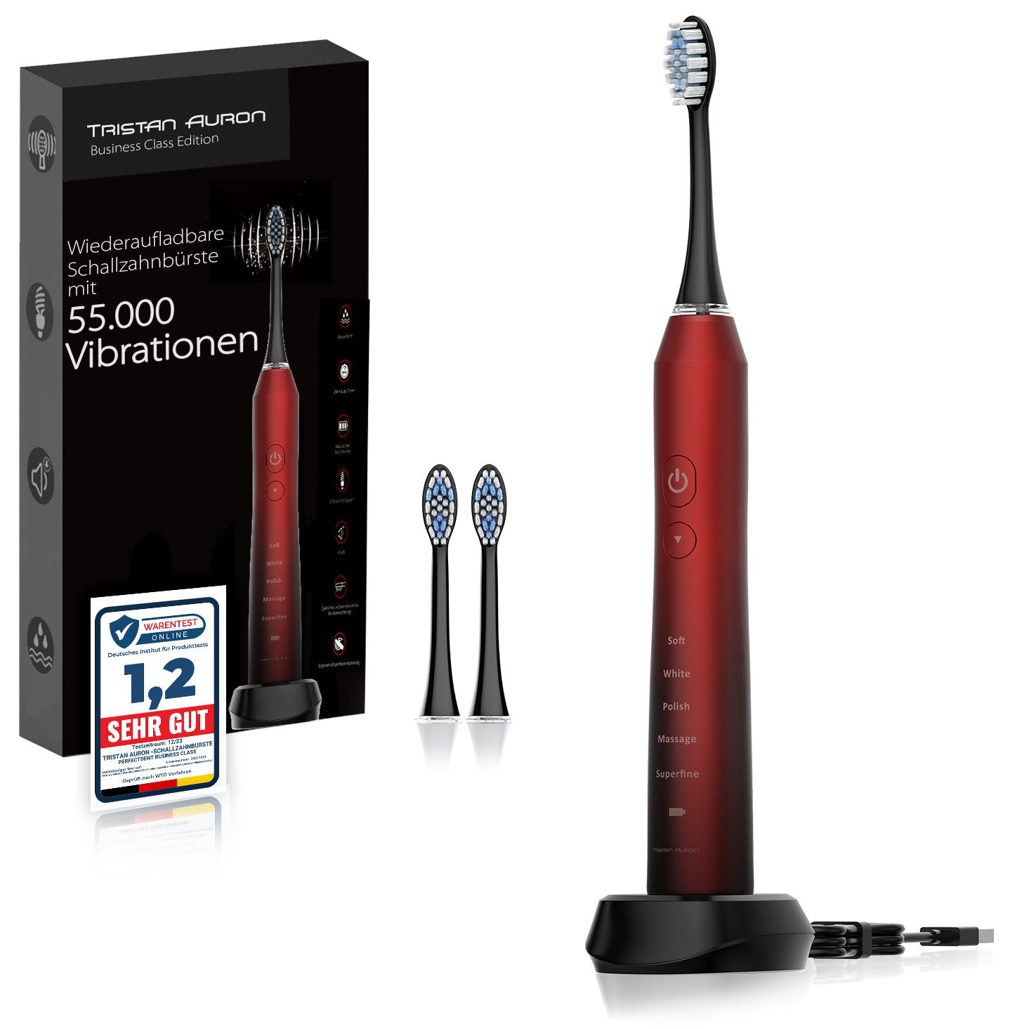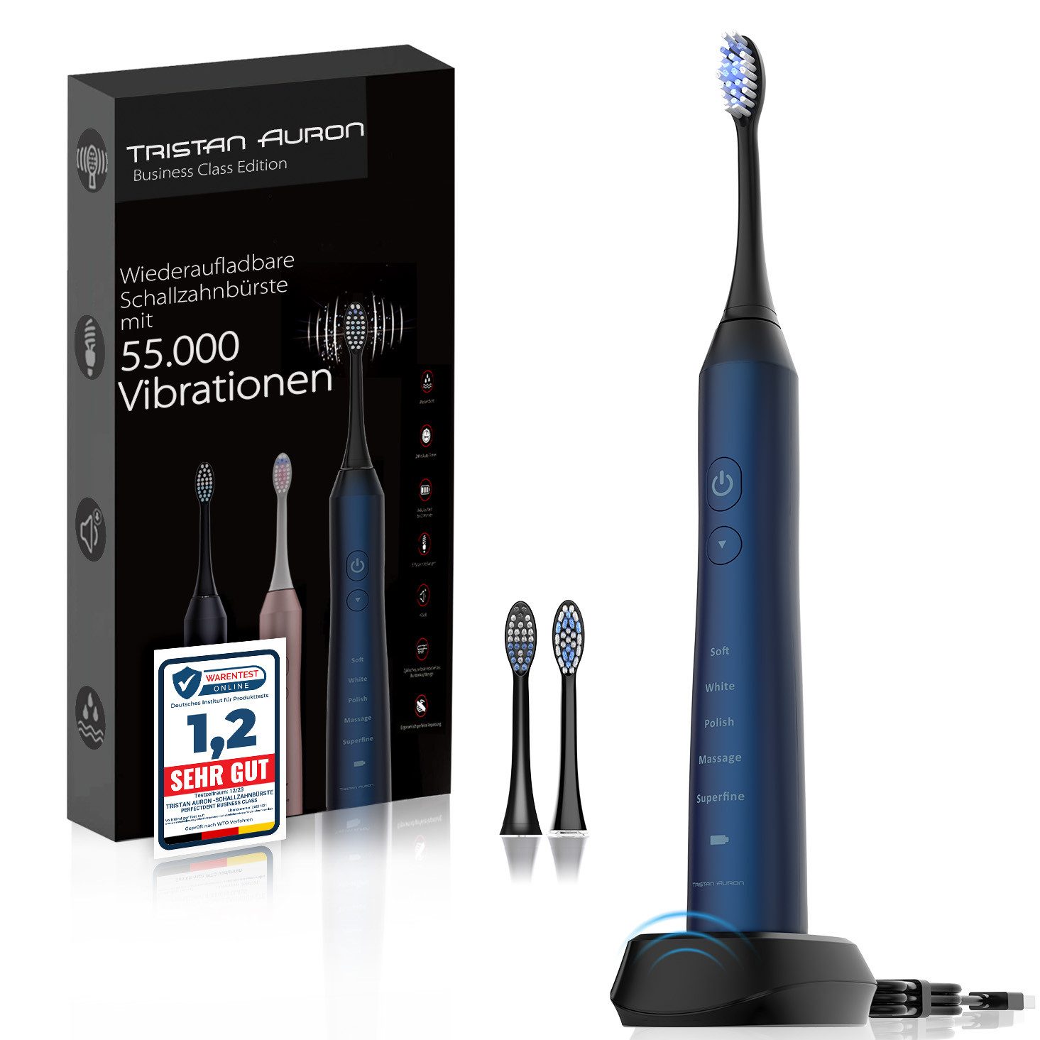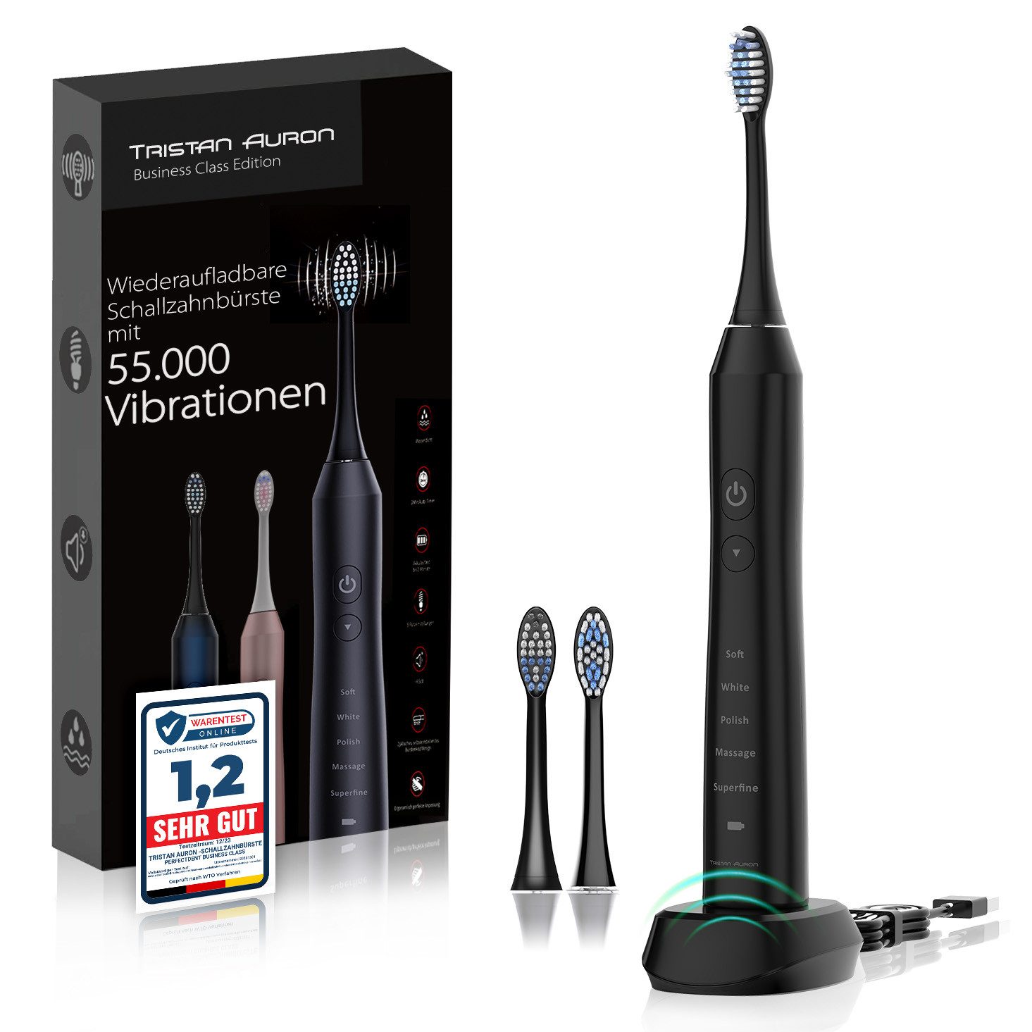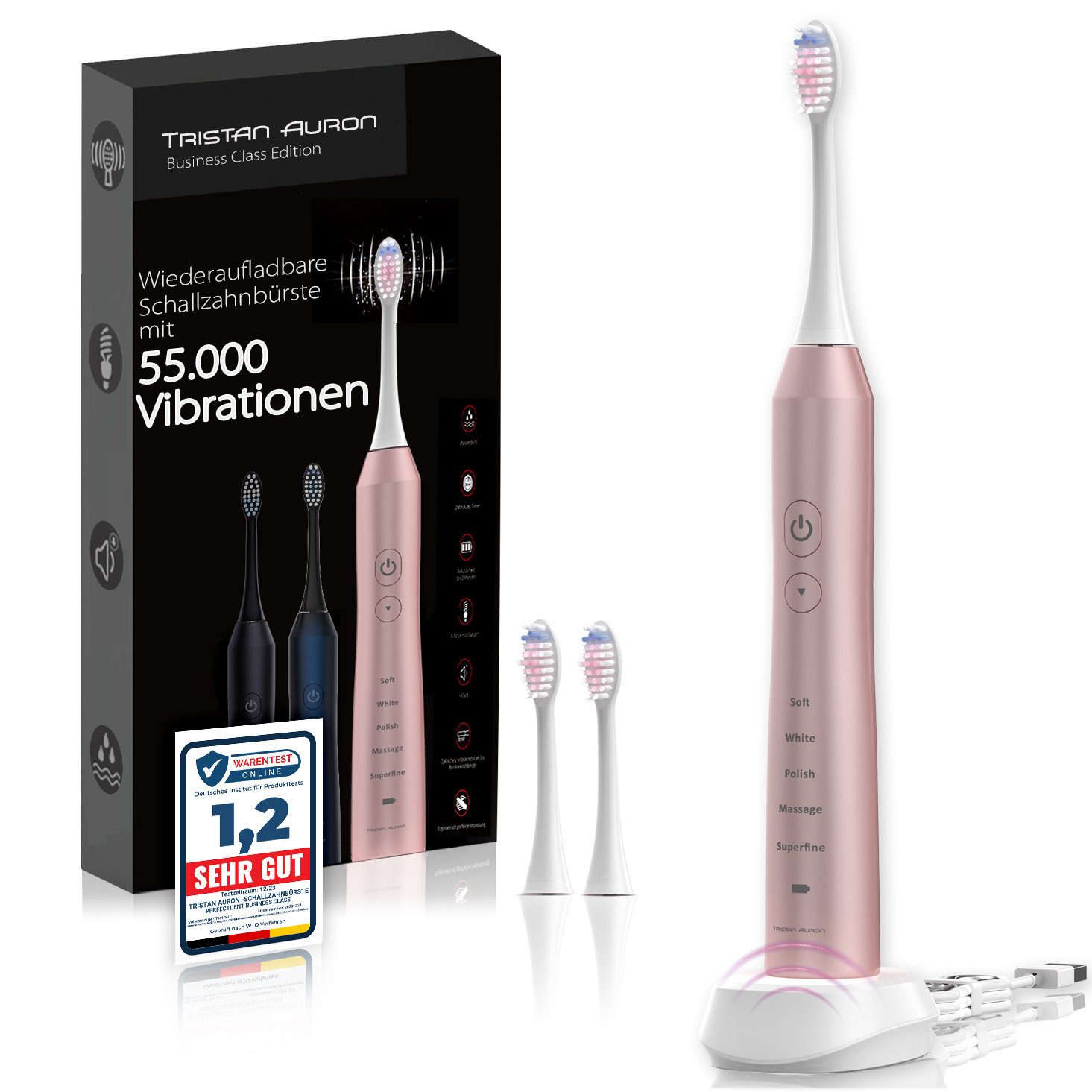 Lieferumfang | 1x Schallzahnbürste 1x Induktion Ladestation 2x Aufsteckbürsten |