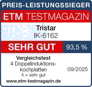 Die Tristar IK-6162 erzielt im Vergleichstest des „ETM TESTMAGAZINS“ mit drei weiteren Doppelinduktionskochplatten das Gesamtergebnis „sehr gut (93,5 %)“. Die „sehr gute“ Leistung überzeugt. Das Gerät bietet sehr viele Funktionen. Es ist sehr einfach zu bedienen und leicht zu reinigen. Der Stromverbrauch ist sehr gering. Außerdem ist es „sehr gut“ verarbeitet. Insgesamt erreicht das Modell das zweitbeste Ergebnis im Test und ist der „PREIS-LEISTUNGSSIEGER“.