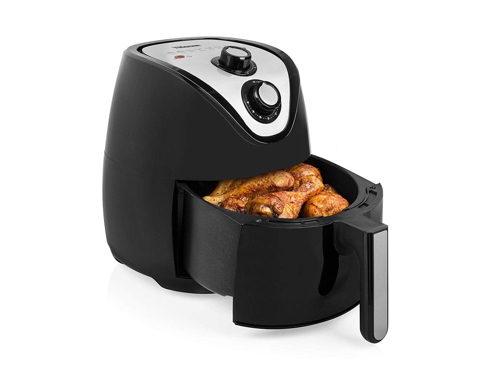 Top-Features | Die große Crispy-Fritteuse ist die Lösung, wenn Sie eine kompakte Heißluftfritteuse suchen. Die Heißluftfritteuse nutzt Heißluftkonvektion, so dass Sie Backen, Frittieren, Braten und Grillen können, ohne Fett zu verwenden Selbst mit 4,5 l Fassungsvermögen nimmt sie nicht viel Platz ein. Das reicht aus, um sieben Portionen Pommes Frites gleichzeitig zuzubereiten. Mit dem Drehregler für Garzeit und Temperatur finden Sie immer die richtige Einstellung für Ihr Gericht. Die Temperatur kann zwischen 80 und 200 °C und der Timer mit Alarmton auf bis zu 30 Minuten eingestellt werden. Ohne Öl oder mit nur ganz wenig Öl erhalten Sie dank der hohen Konvektionsgeschwindigkeit der Luft ein äußerst knuspriges Ergebnis. |