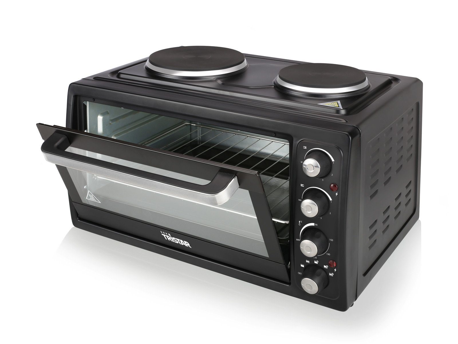 Ausstattung | Wärmeisoliertes Gehäuse Doppelglastür 2 Kochplatten - Durchmesser Kochplatte 1 18,5 cm - Durchmesser Heizplatte 2 15,5 cm Zubehör: Backblech, Grillrost, Zange Innenbeleuchtung Kontrolllampen Regelbarer Thermostat |