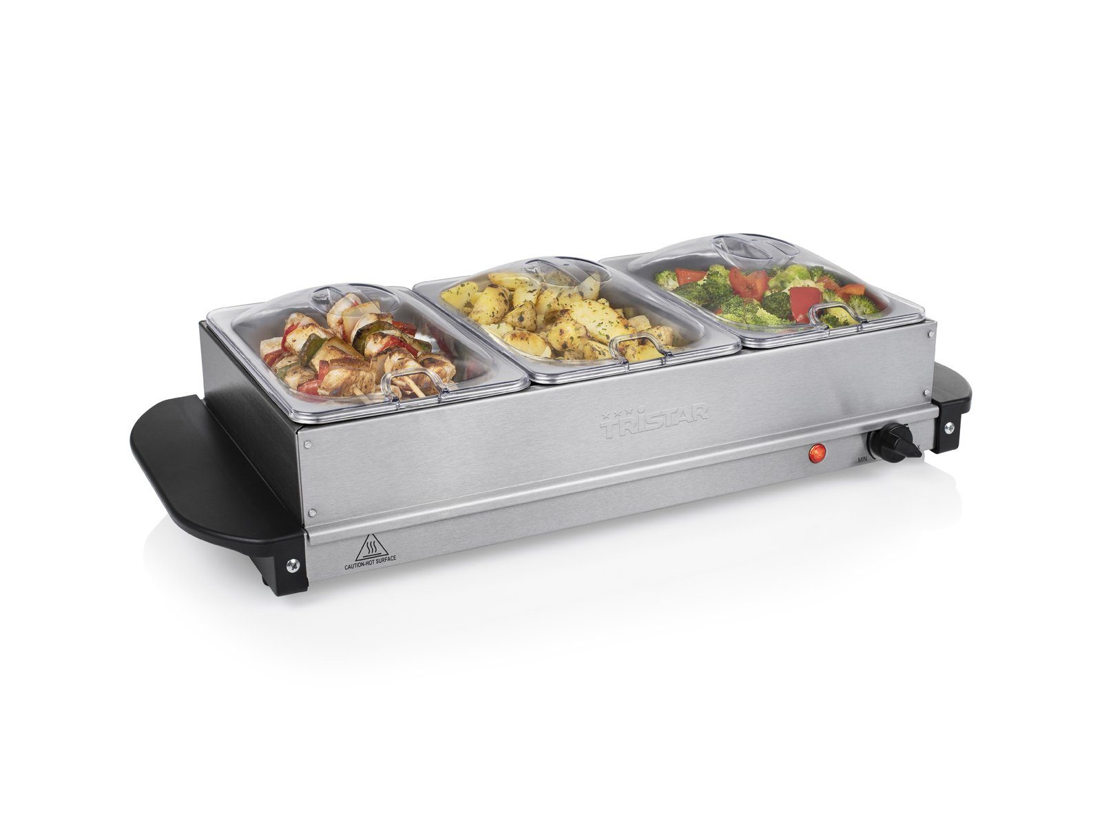 Top-Features | Mit diesem multifunktionalen Buffetwärmer und Kochplatte mit Thermostat halten Sie Ihre Speisen, Pfannen und Teller leicht auf der richtigen Temperatur Ausgestattet mit drei Edelstahlschalen und Kunststoffdeckeln |