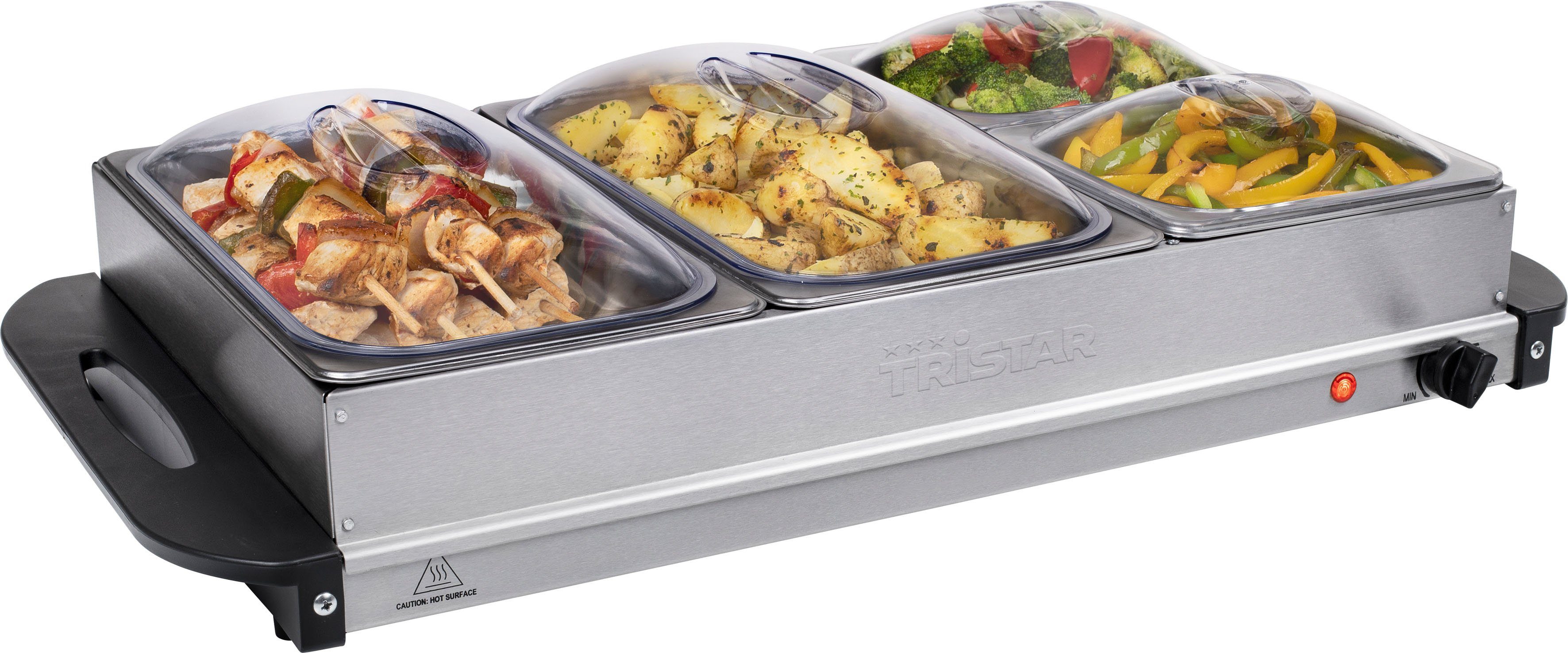 Впередe Vorteile | 2-in-1 Buffetwärmer und Heizplatte Die Behälter haben einen Deckel, so dass Ihre Speisen geschützt sind und in den Behältern warm bleiben. Die Speisen in den Behältern bleiben auf der richtigen Temperatur. Ideal, wenn Sie eine Party geben. Sie können den Buffet Server aber auch mit nach draußen nehmen, ohne Angst haben zu müssen, dass irgendetwas in Ihre Speisen gerät. Die Wärmebehälter haben ein Fassungsvermögen von 6,8 l. Wie das Gehäuse sind sie aus Edelstahl. Wenn sich die darunter befindliche Heizplatte erhitzt, erwärmen sich auch die Schalen allmählich. Mit dem Thermostat am Tristar BP-6285 Buffet Server können Sie die gewünschte Temperatur einstellen. Die Kontrollleuchte zeigt an, wenn die Heizplatte eingeschaltet ist. Es gibt auch eine Warmhaltefunktion, die sicherstellt, dass Ihre Speisen nicht kalt werden. |