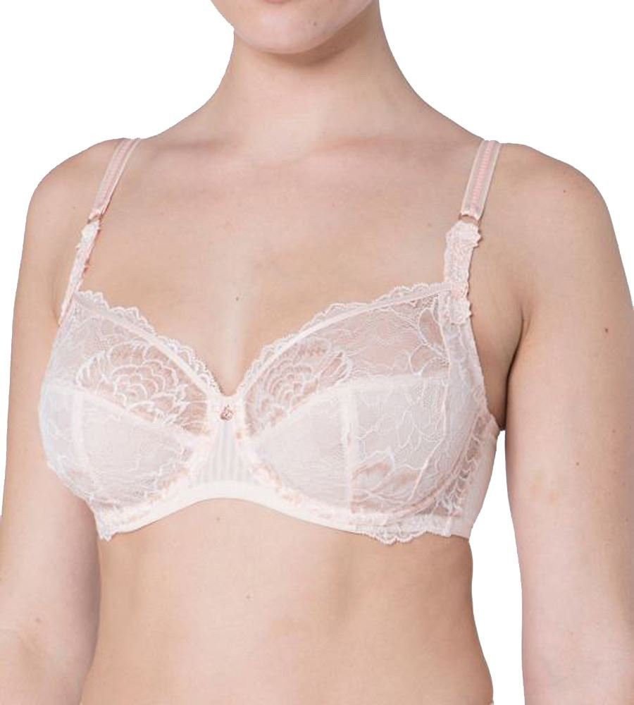 Die Cups verfügen über eine neue vierteilige Verarbeitung, die eine noch perfektere Anpassung an die Brust ermöglicht und eine natürlich geformte Silhouette schafft. Das edle Spitzenmaterial, verziert mit Pfingstrosen-Motiven, verleiht dem BH eine exquisite Optik, während der Steg aus Jacquard-Tüll mit einem feinen Streifenmuster und einer kleinen, roségoldfarbenen Pfingstrose in der vorderen Mitte das Design abrundet.