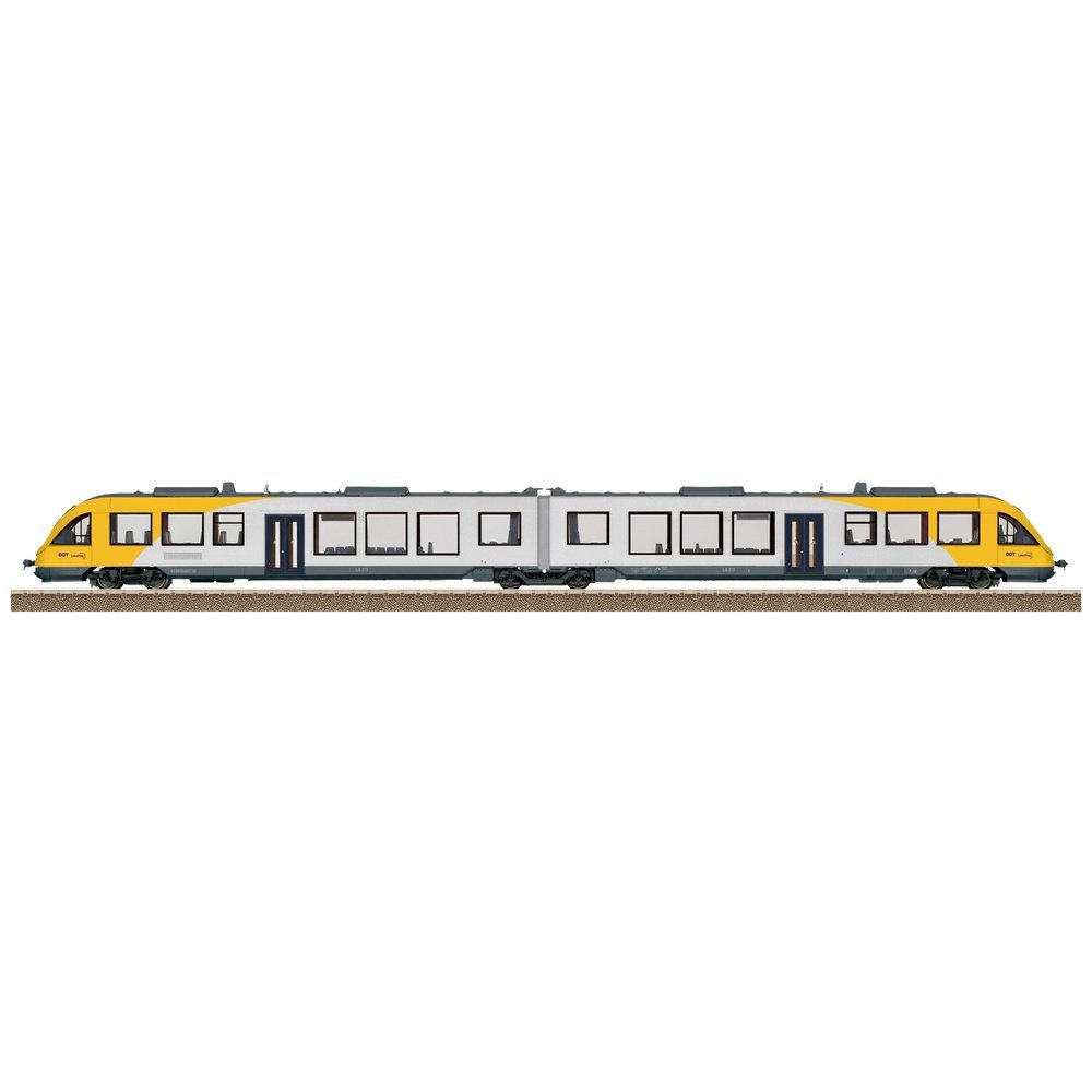 Vorbild: Nahverkehrs-Dieseltriebwagen Baureihe 648.2 (LINT 41) Lokalbanen a/s (Lokaltog). Ausführung mit Tiefeinstiegen. Einsatz im Verkehrsbereich Gilleleje, Dänemark. Mit Zugziel-Anzeige 94OR Gilleleje. Triebwagen-Betriebsnummern 648 113-2 und 648 213-0. Betriebszustand 2021. Modell: Mit Digital-Decoder und umfangreichen Geräuschfunktionen. Geregelter Hochleistungsantrieb mit Schwungmasse im Jakobs-Drehgestell angeordnet. 2 Achsen angetrieben. Haftreifen. Fahrtrichtungsabhängig wechselndes Dreilicht-Spitzensignal und zwei rote Schlusslichter konventionell in Betrieb, digital schaltbar. Spitzenlicht an Triebwagenseite 2 und 1 jeweils separat digital abschaltbar. Serienmäßig eingebaute Innenbeleuchtung. Spitzensignal und Innenbeleuchtung mit wartungsfreien warmweißen und roten Leuchtdioden (LED). Zugzielanzeige vorbildgerecht mit gelben LEDs. Spitzensignal, Zugzielanzeige und Innenbeleuchtung konventionell in Betrieb, digital schaltbar. Detaillierte Ausführung von Fahrwerk und Aufbau. Freier Durchblick. Geschlossener Faltenbalg und Kulissenführung am Jakobs-Drehgestell zwischen den Fahrzeughälften. An den Enden Darstellung der Mittelpufferkupplungen.Gesamtlänge ca. 48,1 cm. Dieses Modell finden Sie in Wechselstromausführung im Märklin H0-Меню unter der Artikelnummer 37715