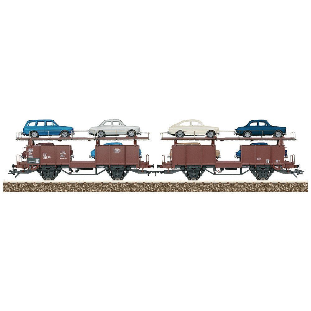Vorbild: Autotransportwagen Bauart Laaes 541 der Deutschen Bundesbahn (DB). Zweistöckige Ausführung. Betriebszustand um 1971. Modell: Feste Kurzkupplung zwischen den Wagenhälften. Oberdeck absenkbar. Neue Betriebsnummer. Beladen mit 8 unterschiedlichen Modellen des VW Typ 3 1500 und 1600 der Firma Brekina. Passende Haltekeile liegen bei. Длина über Puffer 25,3 cm.Wechselstromradsatz E700150. Passende Güterwagen finden Sie im Trix H0-Меню unter der Artikelnummer 24161und im Märklin H0-Меню unter der Artikelnummer 46129, 46139 und 46661