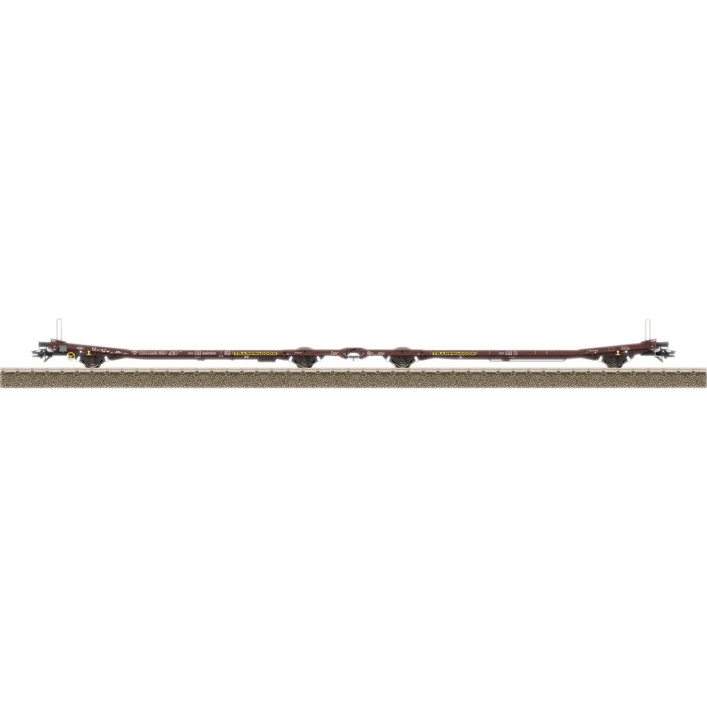Vorbild: Flachwagen-Paar Bauart Laads 800B. Privatwagen der Transwaggon GmbH, Hamburg, eingestellt bei der Deutschen Bahn AG. Rotbraune Grundfarbgebung. Betriebszustand ab 1999.