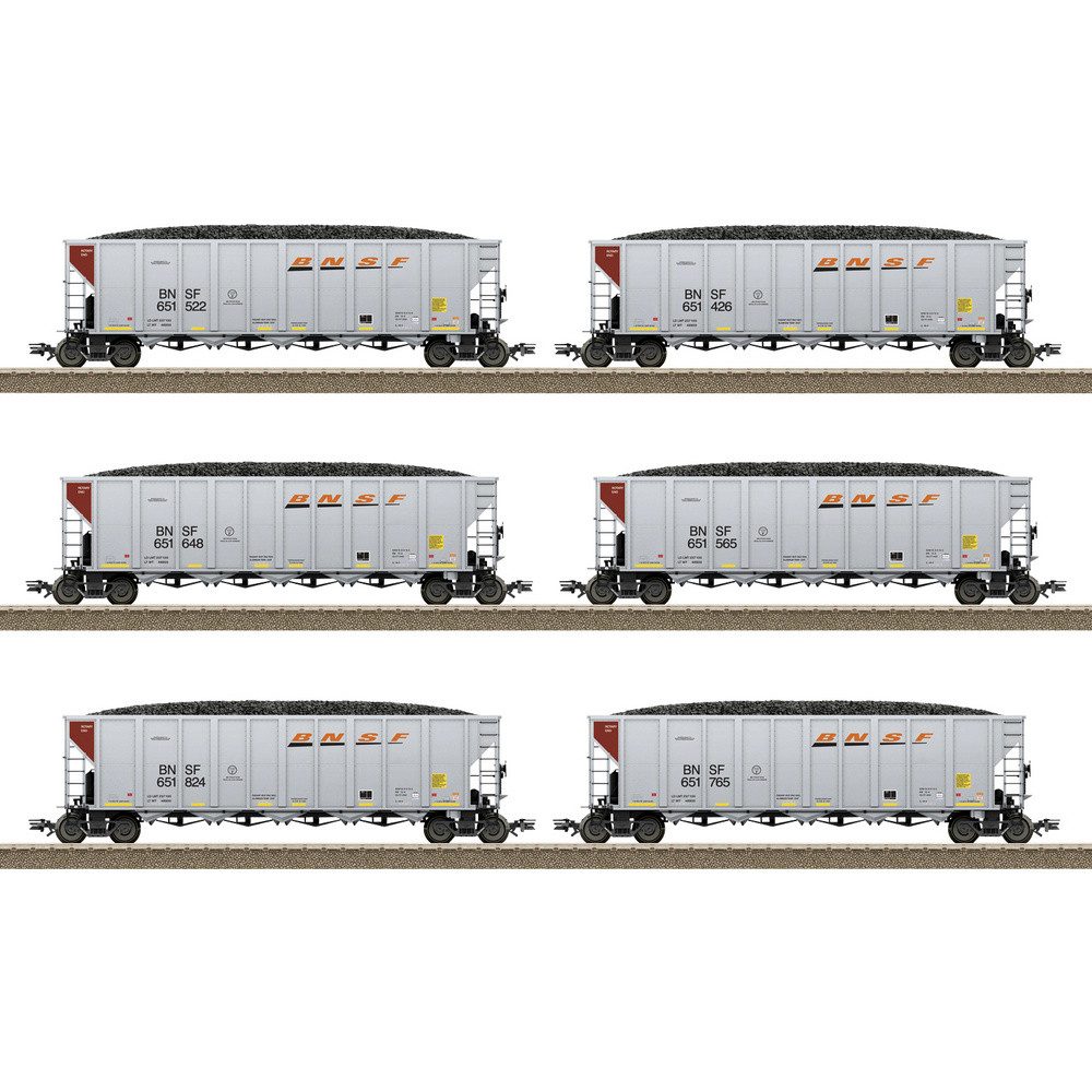 Vorbild: Sechs Kohletransportwagen, sogenannte Hopper Cars, der Burlington Northern Santa Fe, LLC (BNSF). Ausführung mit fünf Entladeeinrichtungen am Wagenboden. Aktueller Betriebszustand.