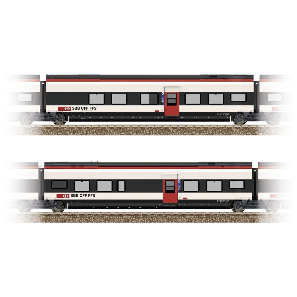 Vorbild: Ergänzungswagen für den Hochgeschwindigkeits-Triebzug RABe 501 Giruno der Schweizerischen Bundesbahnen (SBB). 1 Mittelwagen B (B11), 2. Klasse, mit Pantograph. 1 Mittelwagen C (B10), 2. Klasse. Aktueller Betriebszustand 2021. Modell: 2-teiliges Ergänzungswagen-Set zur Erweiterung des Hochgeschwindigkeits-Triebzuges RABe 501 Giruno auf eine 11-teilige Einheit. Serienmäßig eingebaute Innenbeleuchtung mit wartungsfreien warmweißen Leuchtdioden (LED). Die Innenbeleuchtung wird versorgt über die durchgehende elektrische Verbindung des ganzen Zuges und ist nur funktionsfähig und digital schaltbar im Verbund mit der Grundgarnitur. Pantograph auf einem Mittelwagen ist ebenfalls nur im Verbund mit der Grundgarnitur über den Decoder als Digital-Funktion separat heb- und senkbar. Beide Mittelwagen sind fest miteinander gekuppelt. Kulissenführung in den Jakobs-Drehgestellen. Maßstäbliche Nachbildung. Befahrbarer Mindestradius 360 mm. Длина des Wagen-Paares 40,2 cm. Die Grundgarnitur 25810 ist mit den Ergänzungswagen-Sets 23281, 23282 und 23283 auf eine vorbildgerechte 11-teilige Einheit erweiterbar. Dieses Ergänzungswagen-Set zum RABe 501 Giruno finden Sie in Wechselstromausführung im Märklin H0-Меню unter der Artikelnummer 43461