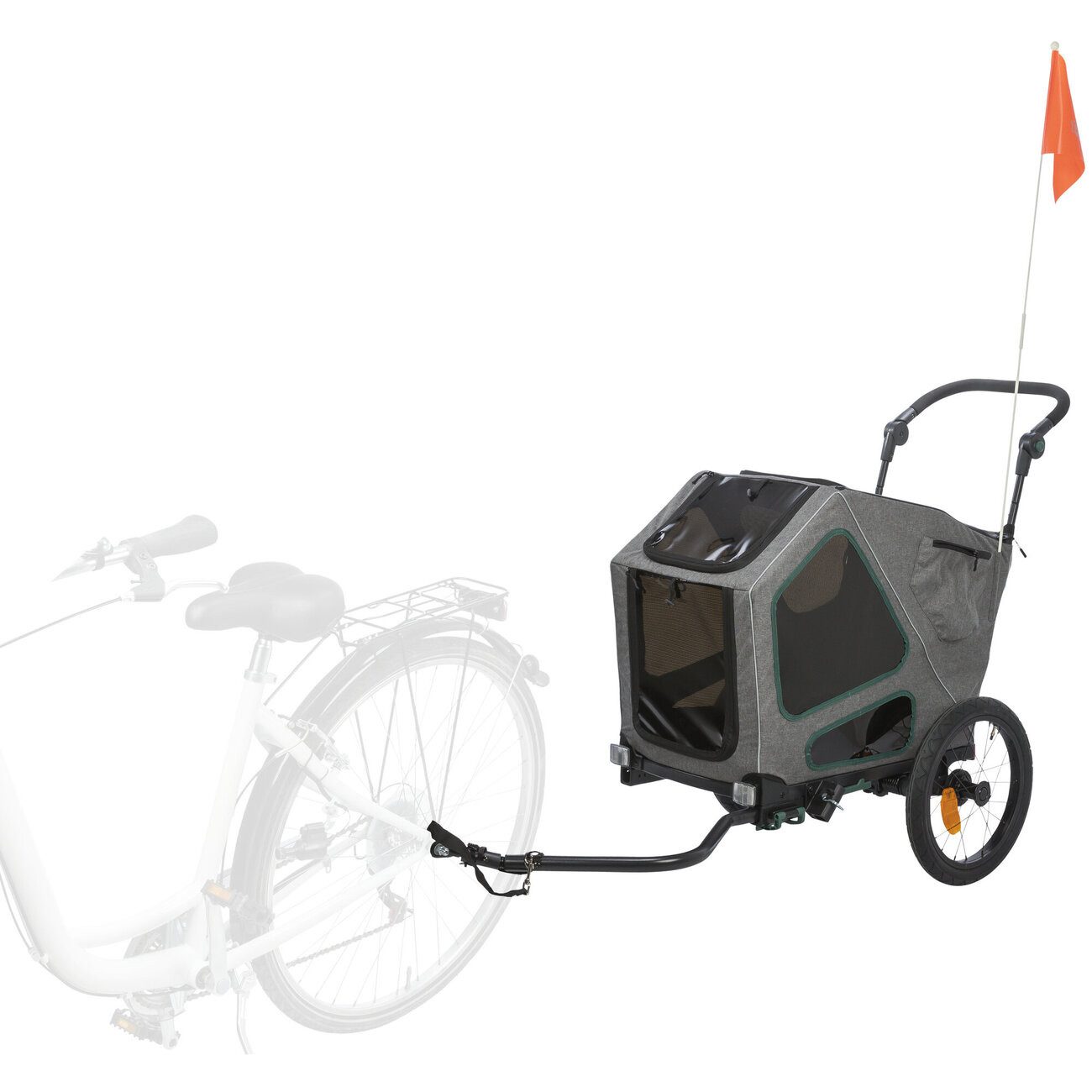Sicherheit und Flexibilität in einem: Der Anhänger bietet höchste Sicherheit mit einer Feststellbremse, Reflektoren, Schlaufen zur Anbringung eines Rücklichts und einem Signalwimpel mit reflektierendem Motiv. Außerdem kann der Hund an der integrierten Kurzleine angeschnallt werden. Zusätzlich punktet er mit zahlreichen Taschen, einem Getränkehalter, höhenverstellbarem Griff und einer zusammenklappbaren Struktur. Inklusive Anhängerkupplung und optional erhältlichem Jogger-Umbausatz (Artikel 12801, 12803, 12805). Der Fahrradanhänger besteht aus stabilem Stahl mit einem strapazierfähigen Polyester-Bezug in den Farben grau/salbei.