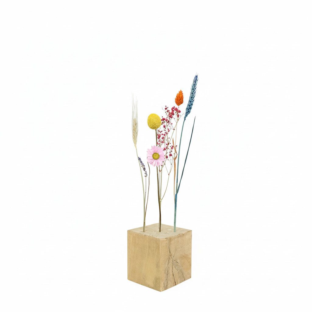 Der edle, massive Holzwürfel aus Eiche (mit den Maßen 10cm x 10cm x 10cm) in Kombination mit vielen verschiedenen Trockenblumen-Elementen, wie Schleierkraut, Lino, Weizen, Craspedia und bunten Blüten geben diesem Dekoelement das gewisse Etwas. Unsere Blumenwiese ist genau das richtige Trockenblumen-Arrangement für den Frühling und den Sommer. Mit ihren vielen verschiedenen und belebenden Farben wird dein Zuhause zum wahren Erlebnis – aufregend und voller Schönheit. Jeder unserer Holzwürfel wurde von uns liebevoll und sorgfältig aus unbehandelter Eiche gefertigt und veredelt. Der natürliche Look mit dezenten Holzrissen, der Maserung und Astlöchern gibt jedem FlowerBar CUBE sein einzigartiges Aussehen. Bitte beachte, dass unsere FlowerBar CUBEs also handgefertigte Unikate und Naturprodukte sind und stets von unseren Shop-Bildern leicht abweichen können. TROCKENBLUMEN – EIN NATURPRODUKT Все von uns getrockneten oder konservierten Blumen werden in liebevoller Handarbeit für dich arrangiert. Da es zu leichten Abweichungen in Farbe und Form kommen kann ist jedes Arrangement ein echtes Unikat. Da es sich bei unseren Blumen um echte, getrocknete Blumen und somit um ein saisonabhängiges Produkt handelt, kann es vorkommen, dass einige Blüten und Elemente deiner Flowerbar durch ein anderes Element der gleichen Farbe ersetzt werden. Das Erscheinungsbild und die Farbpalette deiner Bar bleiben jedoch immer gleich. PFLEGELEICHT Unsere Blumen benötigen kein Wasser und keine besondere Pflege. Ein Platz, der nicht direkt in der Sonne ist, freut sie umso mehr. So können sie ihre Farbintensität noch länger beibehalten. INKLUSION Mit Liebe gefertigt in Werkstätten für Menschen mit Behinderung. Inklusion bedeutet, dass Menschen mit Behinderungen die Möglichkeit haben sollten, in Arbeitsstätten ihre Fähigkeiten und Talente zu entfalten und gleichberechtigt am Arbeitsleben teilzuhaben. Wir unterstützen das!