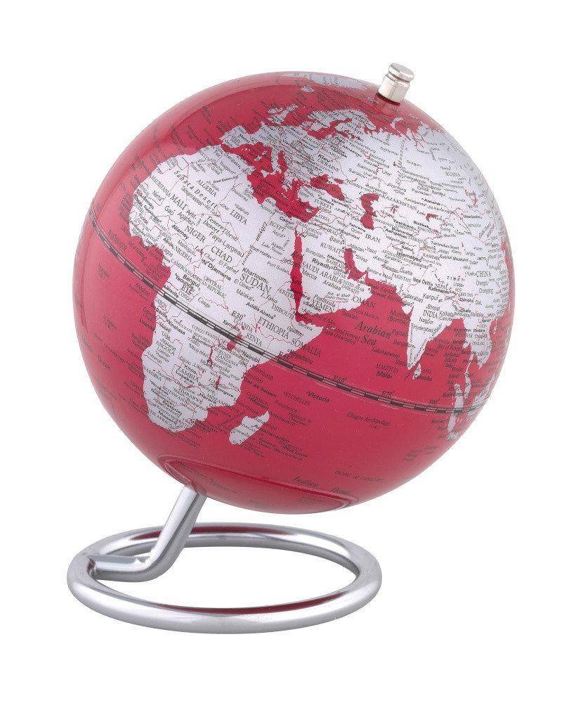 Globus mit 13 cm Durchmesser, verchromter, ringförmiger Metallfuß, bewegliche Achse, Kunststoff, , Metall, , glänzend, rot/silberfarben.