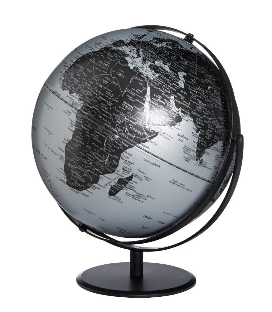 Mit zwei Achsen. Der 300 x 360 Millimeter große Tischglobus JURI kombiniert puristisches Design mit hoher Funktionalität und Qualität. Durch seine zwei Achsen ist der Erdball in alle Dimensionen drehbar und gibt freie Sicht auf alle Winkel der Welt. Der englisch beschriftete Globus hat ein verchromtes Metallgestell und einen Metallfuß. Je nach Wunsch gibt es ihn mit verchromtem Metallfuß und mit glänzender Weltkugel oder alternativ mit schwarz mattem Metallfuß und mit matter Weltkugel.