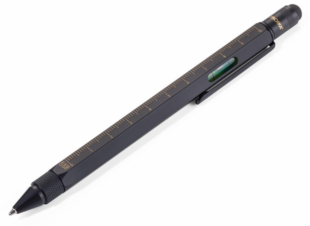 Multitasking-Kugelschreiber, Zentimeter-/Zoll-Lineal, 1:20/1:50 Skala, Wasserwaage, Schlitz-/Kreuzschraubendreher, Stylus, schwarze Mine, Messing, lackiert, matt, goldfarben/schwarz
