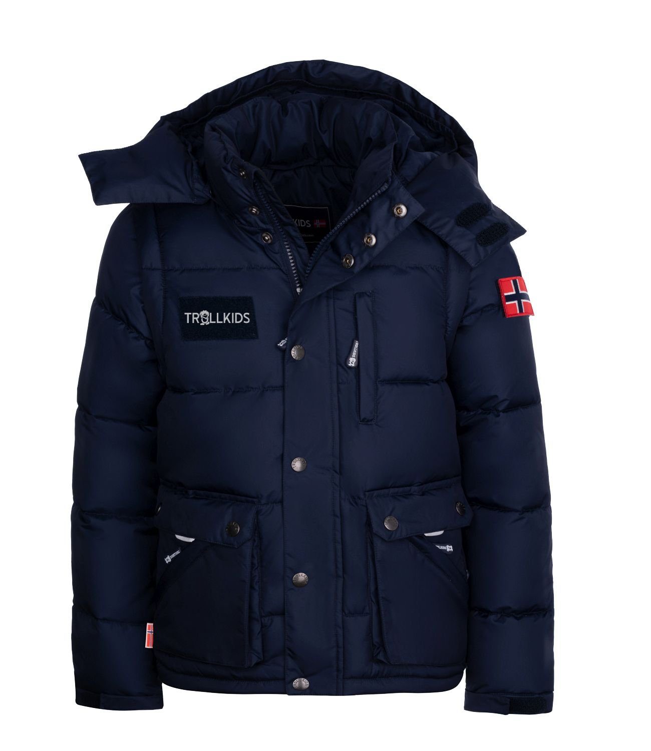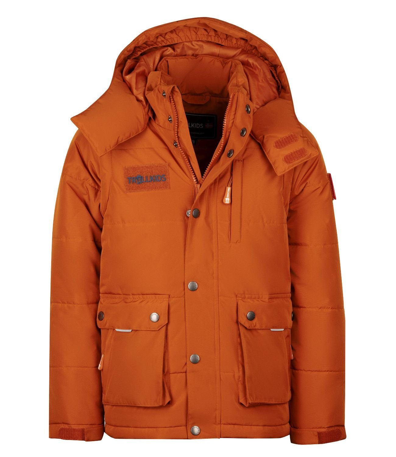 Das KIDS HOLMDALEN ZIP OFF JACKET XT ist eine warm wattierte, wasserdichte Parka-Jacke, die durch ihre Wärmeleistung, ihre Vielseitigkeit und ihre besonderen Details überzeugt: Die Ärmel – übrigens mit Bündchen mit Daumenloch – sind abnehmbar, so dass sich die Jacke im Handumdrehen in eine warme Weste verwandeln lässt. Auch die gefütterte, verstellbare Kapuze ist abnehmbar. Optisch überzeugt die Jacke durch raffinierte Details: so zum Beispiel durch die beiden aufgesetzten Taschen mit ihrer jeweiligen Unterteilung in eine Tasche mit Druckknopfverschluss und eine darauf aufgesetzte schräge Reißverschlusstasche. Klett-Flächen am Oberarm sowie an der Brust lassen sich mit den mitgelieferten Logo- bzw. Motiv-Badges von Trollkids versehen oder bieten Platz für andere Klett-Badges, so dass dem KIDS HOLMDALEN ZIP OFF JACKET XT immer wieder ein neuer Look verliehen werden kann. Die Wassersäule der Außenjacke beträgt 6.000 mm/m², die Atmungsaktivität 6.000 g/m²/24h. Material: 100 % Polyester; Futter: 100 % Polyamid; Füllung: 100 % Polyester; Gewicht: 690 g