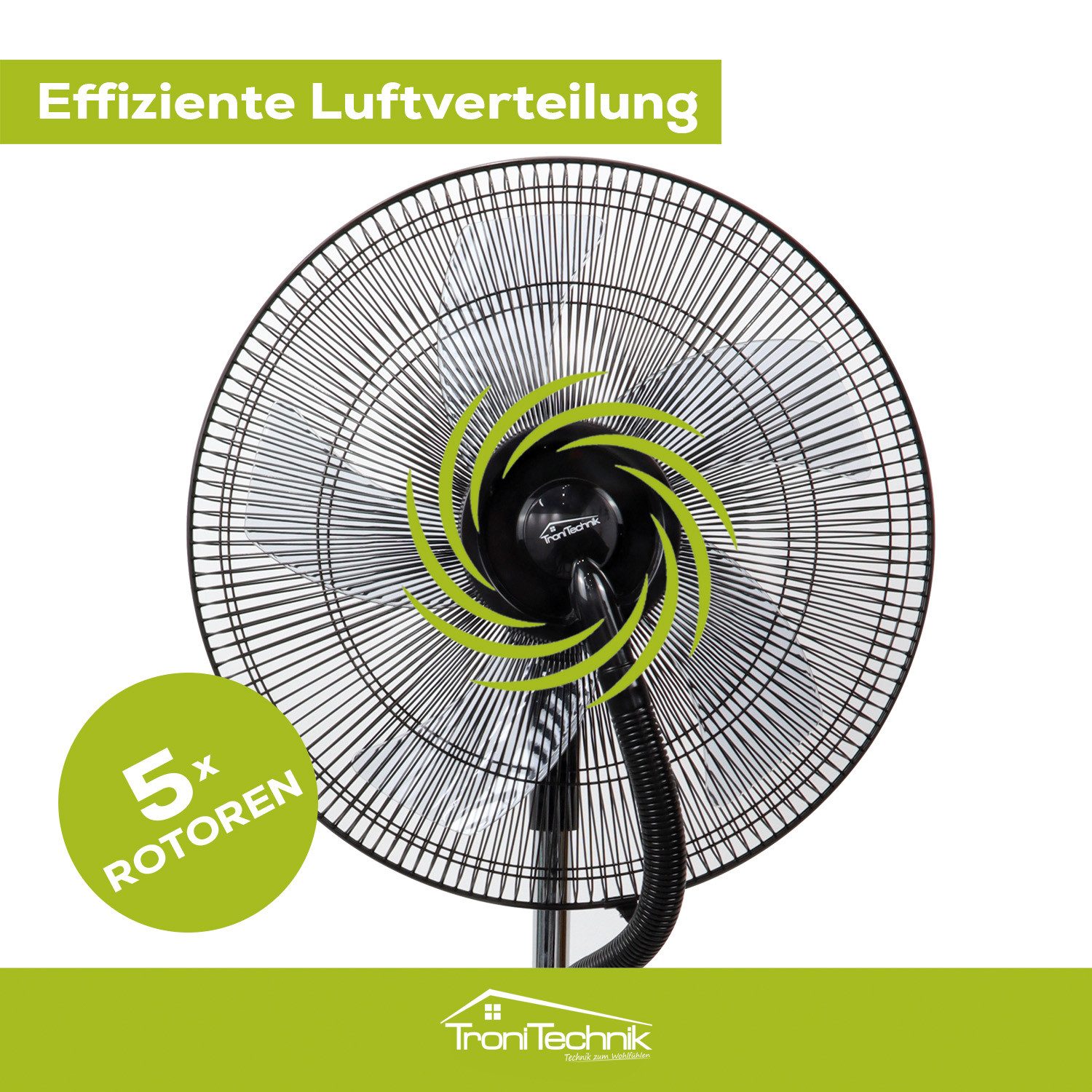 Впередe Vorteile | Das dreiblättrige Flügelblatt gewährt eine effektive und zugleich leise Art der Abkühlung bei warmen Temperaturen. Der Ventilator hat ein Sprühnebelsystem, welches die Luft mithilfe Wasserdispersion zusätzlich kühlt. |