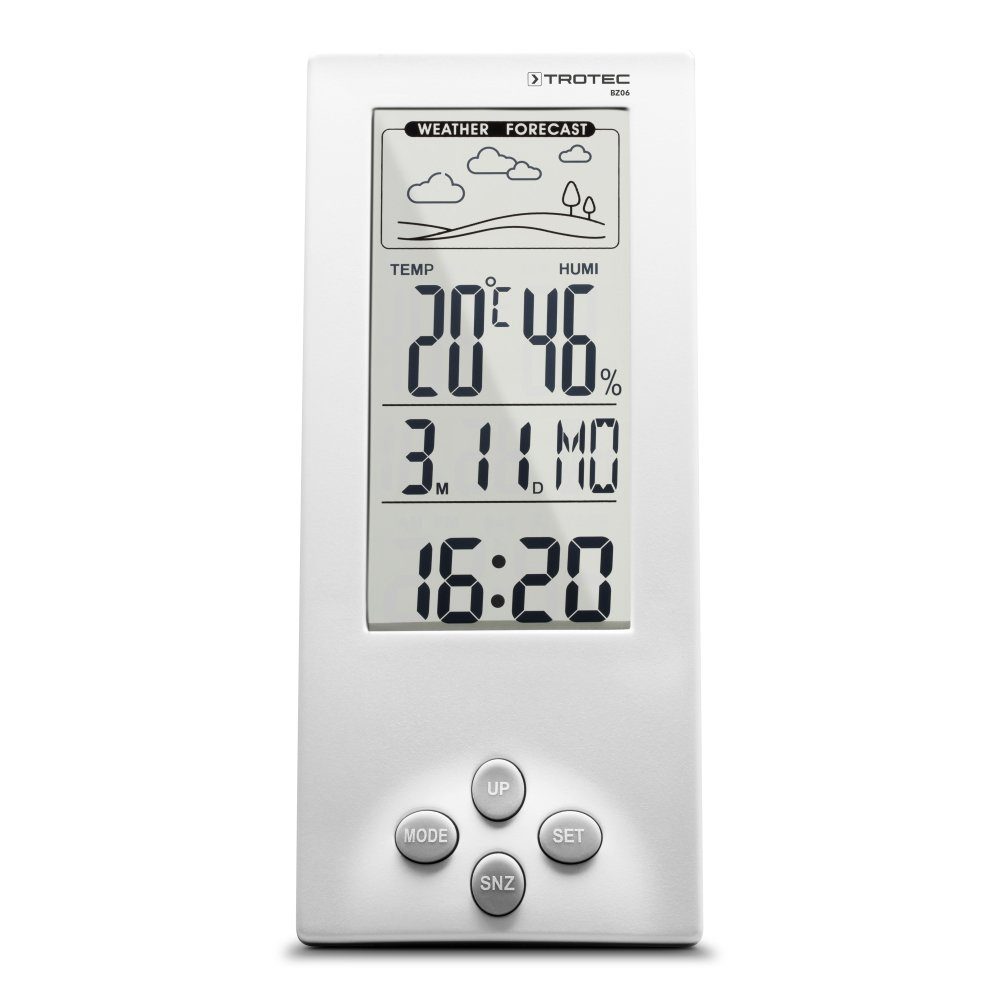 Voller Durchblick bei Raumklima und Wetter Auf dem gut ablesbaren Digitaldisplay werden Ihnen die aktuelle Innenraumtemperatur (in °C oder °F), die Luftfeuchtigkeit (in %), das Datum, der Wochentag sowie die Uhrzeit in großen Digitalziffern angezeigt. Die grafisch gestaltete Wettertrend-Prognose signalisiert Ihnen darüber hinaus bevorstehende Wetterwechsel. Ein besonders attraktiver und verblüffender Hingucker ist das komplett durchsichtige Display dieser Innenraum-Klimastation. Abgerundet wird die Multi-Funktionalität durch einen Weckmodus mit komfortabler Schlummer-Taste (Snooze).