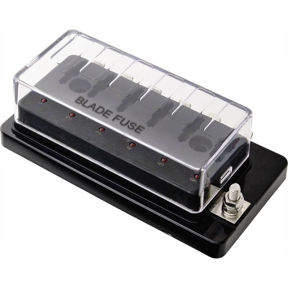Eigenschaften | Anschluss (Bauelemente): Flachstecker 6.3 mm · Anzahl Sicherungen: 6 · Montageart: Aufbau · Nennspannung: 32 V/DC · Nennstrom: 30 A · Passend für (Sicherungen): Flachsicherung Standard · Plastikfreie Verpackung: Plastikfreie Verpackung · Sicherungs-Besonderheiten: mit Statusanzeige |
