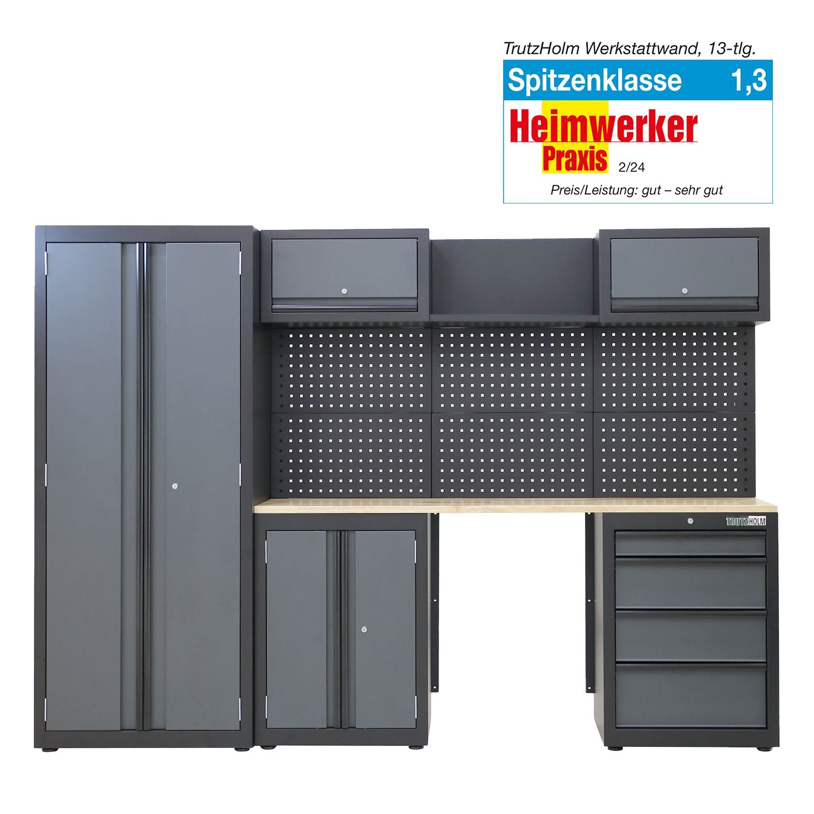 Mit dem 13-teiligen Werkstattschranksystem von TRUTZHOLM bringen Sie Ordnung und Effizienz in Ihre Werkstatt! Gefertigt aus robustem, pulverbeschichtetem Stahl, zeichnet sich die Werkstattwand durch ihre Stabilität, Rostfreiheit und Langlebigkeit aus. Das Schranksystem ist flexibel zusammenstellbar, sodass Sie Ihre räumlichen Gegebenheiten optimal ausnutzen können. Die vielfältigen Aufbewahrungsmöglichkeiten, darunter Schränke, Regale und Schubladen, ermöglichen das Verstauen von Werkzeugen in unterschiedlichen Größen und Ausführungen. Eine große, massive Holzarbeitsplatte bietet Ihnen ausreichend Platz bei der Umsetzung Ihrer großen und kleinen Projekte und ist durch eine schützende Versiegelung besonders widerstandsfähig und unempfindlich gegen Beschädigungen und Verunreinigungen. Damit Sie alle Utensilien immer griffbereit haben, befindet sich an der Rückseite der Werkstattwand eine 6-teilige Lochwand zum Aufhängen Ihrer Werkzeuge. Für mehr Sicherheit lassen sich alle Schubladen und Schränke nicht nur magnetisch verriegeln, sondern auch abschließen. Höhenverstellbare Füße gleichen Unebenheiten am Boden aus und sorgen gleichzeitig für einen sicheren und stabilen Stand. Von der Zeitschrift "Heimwerker Praxis" mit der Note 1,3 = Spitzenklasse ausgezeichnet, überzeugt die dort genannte "TRUTZBURG" vor allem durch die exzellente Verarbeitung hochwertiger Materialien, die schnelle und leichte Montage und die Flexibilität des modularen Systems. Den vollständigen Testbericht können Sie hier lesen: