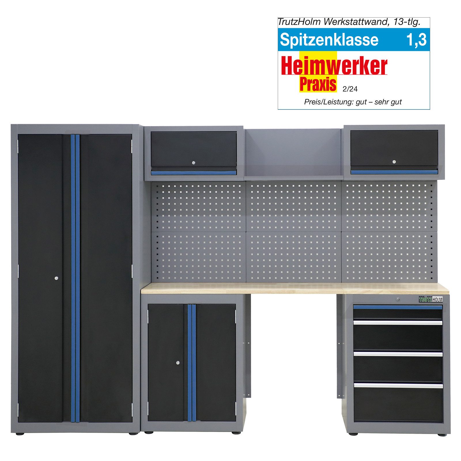 Mit dem 13-teiligen Werkstattschranksystem von TRUTZHOLM bringen Sie Ordnung und Effizienz in Ihre Werkstatt! Gefertigt aus robustem, pulverbeschichtetem Stahl, zeichnet sich die Werkstattwand durch ihre Stabilität, Rostfreiheit und Langlebigkeit aus. Das Schranksystem ist flexibel zusammenstellbar, sodass Sie Ihre räumlichen Gegebenheiten optimal ausnutzen können. Die vielfältigen Aufbewahrungsmöglichkeiten, darunter Schränke, Regale und Schubladen, ermöglichen das Verstauen von Werkzeugen in unterschiedlichen Größen und Ausführungen. Eine große, massive Holzarbeitsplatte bietet Ihnen ausreichend Platz bei der Umsetzung Ihrer großen und kleinen Projekte und ist durch eine schützende Versiegelung besonders widerstandsfähig und unempfindlich gegen Beschädigungen und Verunreinigungen. Damit Sie alle Utensilien immer griffbereit haben, befindet sich an der Rückseite der Werkstattwand eine 6-teilige Lochwand zum Aufhängen Ihrer Werkzeuge. Für mehr Sicherheit lassen sich alle Schubladen und Schränke nicht nur magnetisch verriegeln, sondern auch abschließen. Höhenverstellbare Füße gleichen Unebenheiten am Boden aus und sorgen gleichzeitig für einen sicheren und stabilen Stand. Von der Zeitschrift "Heimwerker Praxis" mit der Note 1,3 = Spitzenklasse ausgezeichnet, überzeugt die dort genannte "TRUTZBURG" vor allem durch die exzellente Verarbeitung hochwertiger Materialien, die schnelle und leichte Montage und die Flexibilität des modularen Systems. Den vollständigen Testbericht können Sie hier lesen: