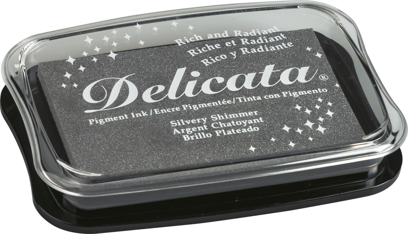 Dieses Stempelkissen 'Delicata Metallic' ist eine Pigmentfarbe auf Wasserbasis die schnell trocknet mit einem dauerhaften metallischen Effekt. Die Trocknungszeit liegt zwischen 5 - 15 Minuten, je nach Untergrund. Setzen Sie hervorragende metallische Akzente auf Geschenkkarten, Geschenkanhänger und Scrapbook-Projekte.