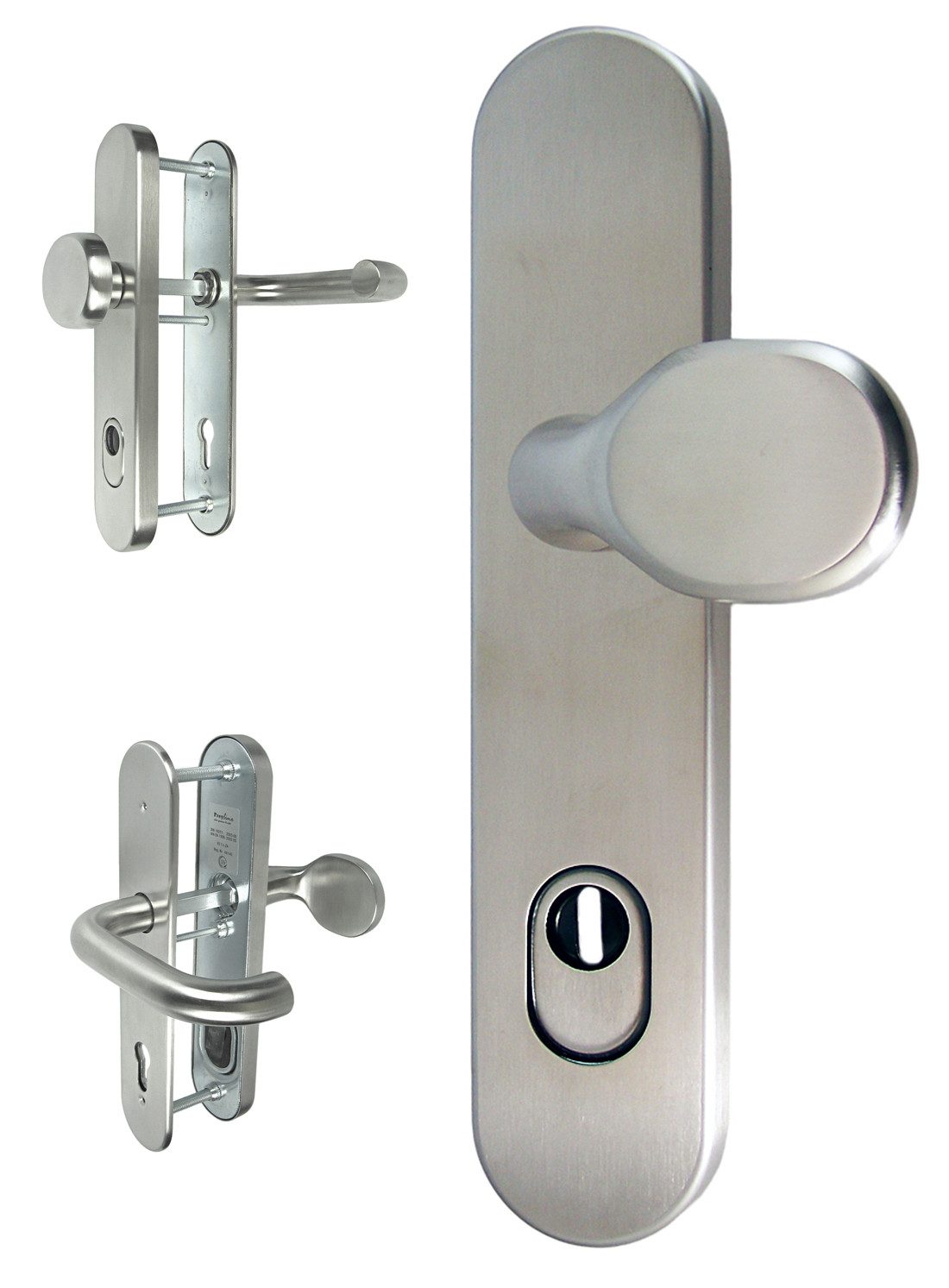 Edelstahl Haustür-Langschild-Garnitur mit Knopf in Edelstahl matt,