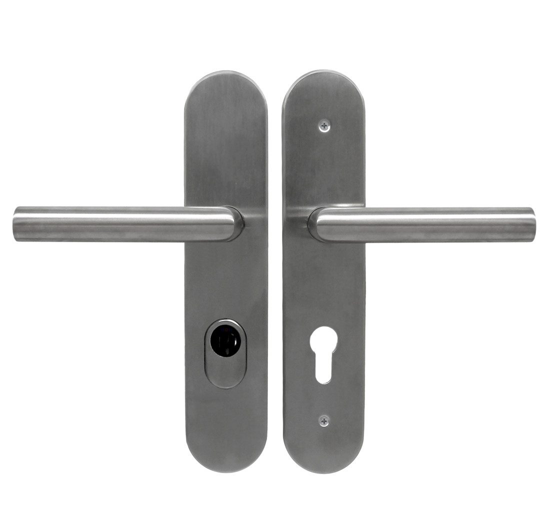 Langschild Schutzgarnitur mit Beidseitig Drücker - Drücker, in Edelstahl gebürstet