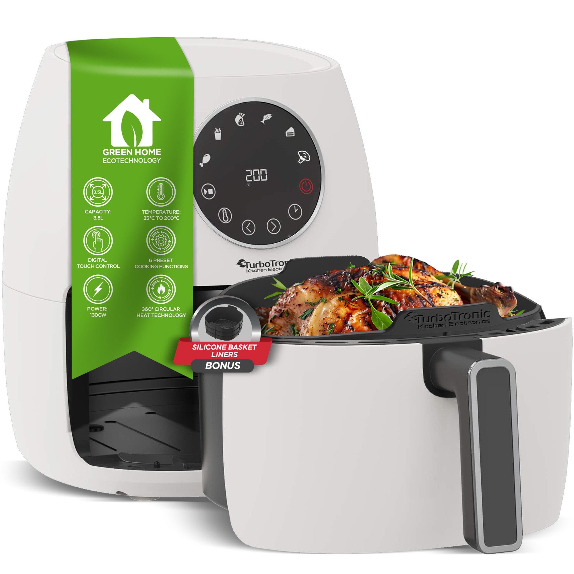 Mit der TurboTronic® TT-AF210 AirChef Pro genießen Sie knusprige Köstlichkeiten wie Pommes Frites, Hähnchen oder Gemüse – und das ganz ohne Öl oder Fett. Stellen Sie sich den Duft von knusprigen, goldbraunen Pommes vor, und das alles ohne einen Tropfen Öl. Ihre Hände gleiten über das moderne Touch-Display, intuitiv wählen Sie eines der 6 voreingestellten Programme aus. Die AirChef Pro übernimmt die Arbeit – präzise, gleichmäßig und blitzschnell. Während die Zeit vergeht, lehnen Sie sich entspannt zurück, denn Sie wissen: Das Ergebnis wird perfekt sein.