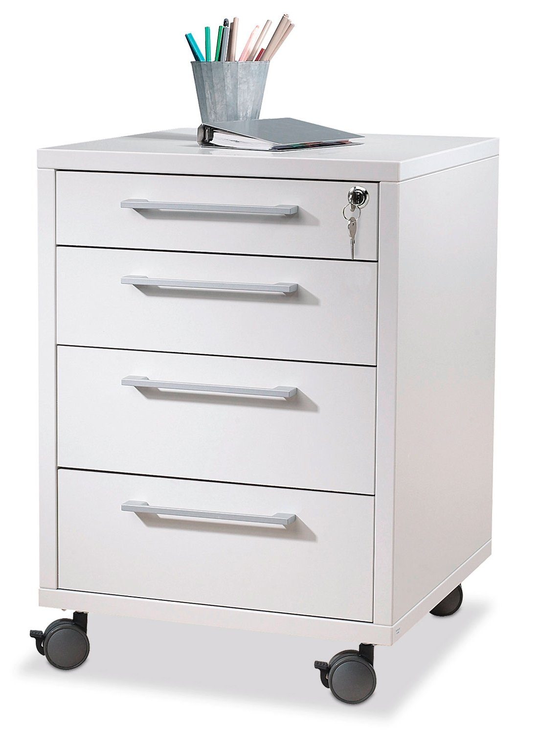 Ein Rollcontainer mit Schubladen darf in keinem Büro fehlen. Dieses Exemplar ist komplett weiß und mit schwarzen Kunststoffrollen ausgestattet. Durch die Feststellbremsen bleiben die vorderen Rollen fest stehen und der Rollcontainer lässt sich nicht mehr einfach von seinem Platz verschieben. Mit insgesamt vier Schubladen ausgestattet verstauen Sie so einiges in diesem Container. Zwei große Schubladen unten und zwei kleine oben. Dabei ist die oberste Schublade mit einem Schlüssel abschließbar und sie können darin auch beruhigt mal etwas über Nacht liegen lassen.