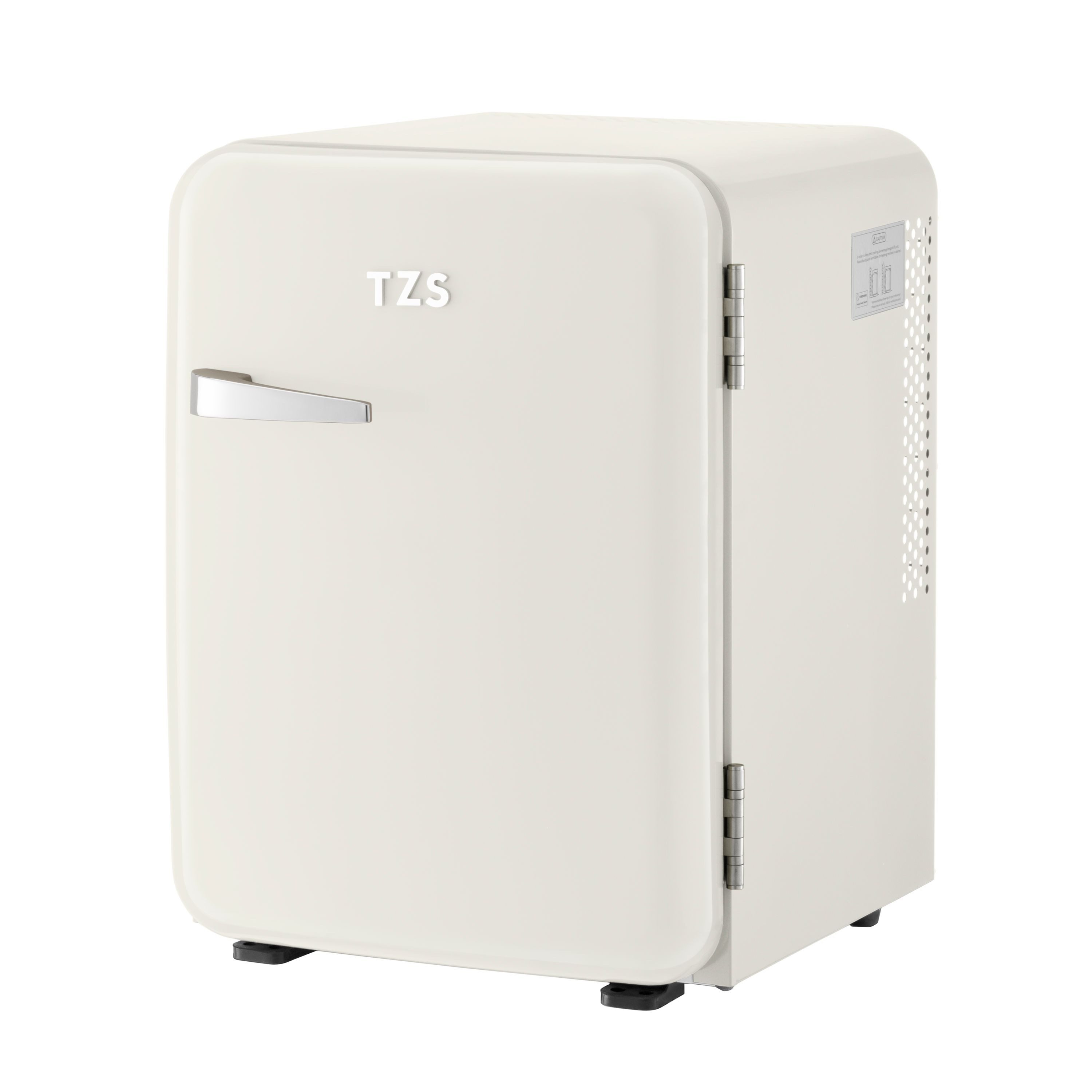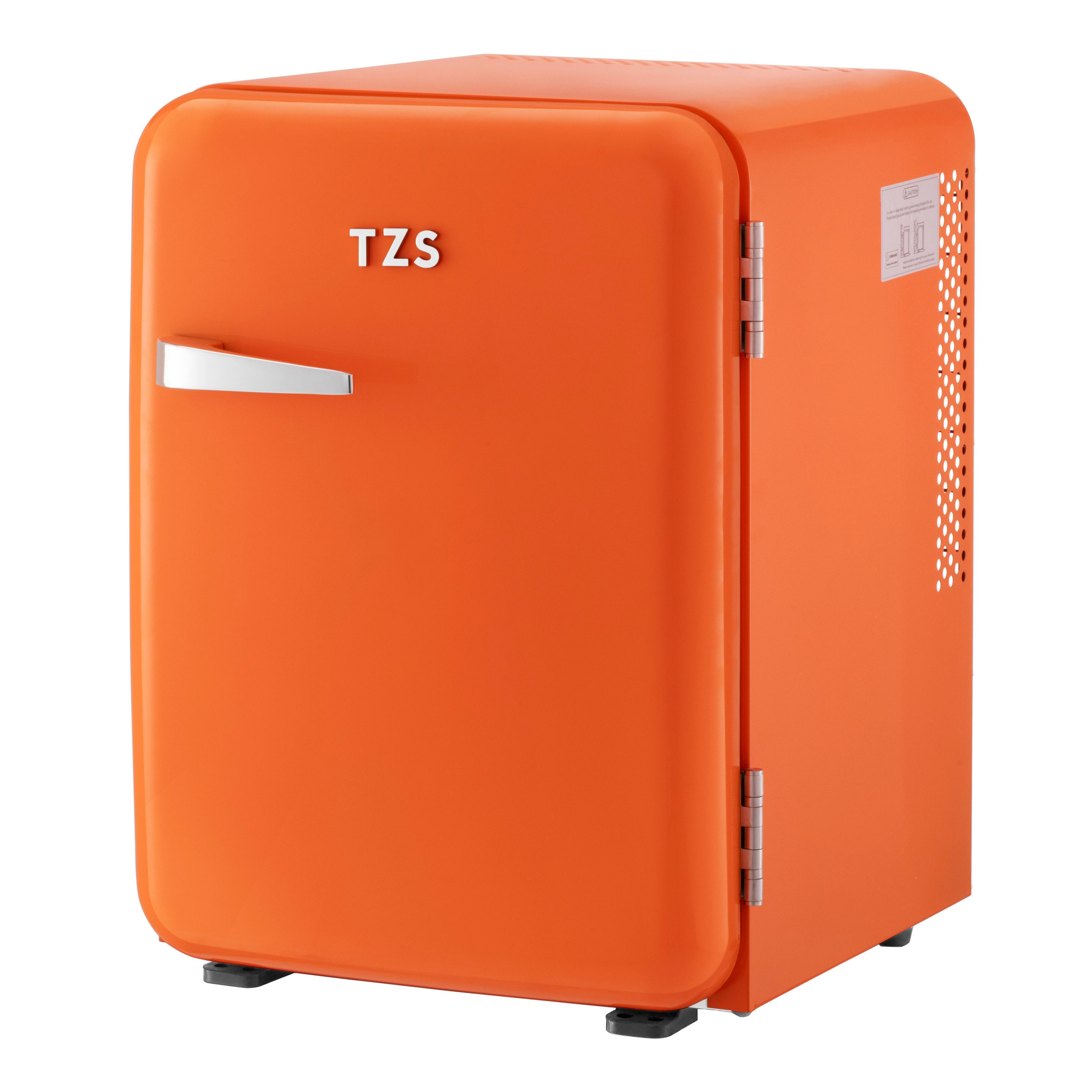 Zur Ausstattung gehören: eine Innenbeleuchtung, ein Kondenswassersammler, zwei verstellbare Türfächer und vier Kunststoffeinlegeböden zur flexiblen Nutzung. Das Highlight ist die absolut stylische Retro-Optik in unterschiedlichen Farben mit einem Hochglanz-Metall-Türgriff und dazu passenden TZS Logo.
