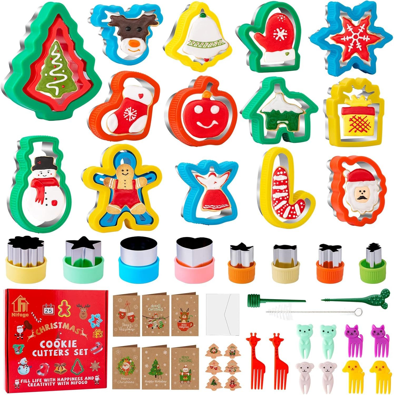 Entdecken Sie unser umfangreiches Set mit 48 Ausstechformen, das 14 verschiedene weihnachtliche Motive umfasst: Weihnachtsbaum, Weihnachtsmann, Rentier, Glocken, Handschuhe, Socken, Schneemann, Lebkuchenmann, Apfel, Zuckerstange, Engel, Schneeflocke, Geschenk und Haus. Zusätzlich erhalten Sie 8 Obst- und Gemüseausstecher, 10 Food Picks, 2 Zubehörteile, eine Reinigungsbürste sowie 6 Grußkarten und Umschläge – perfekt für festliche Anlässe!