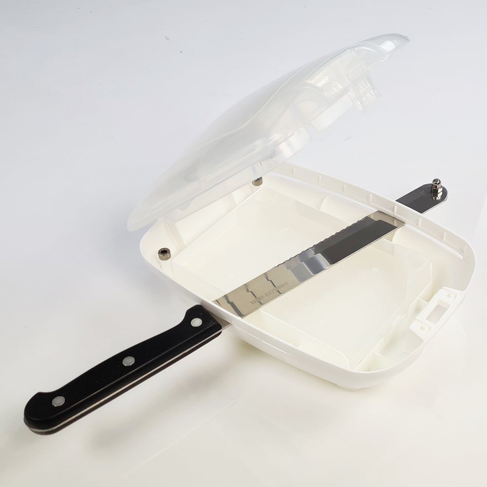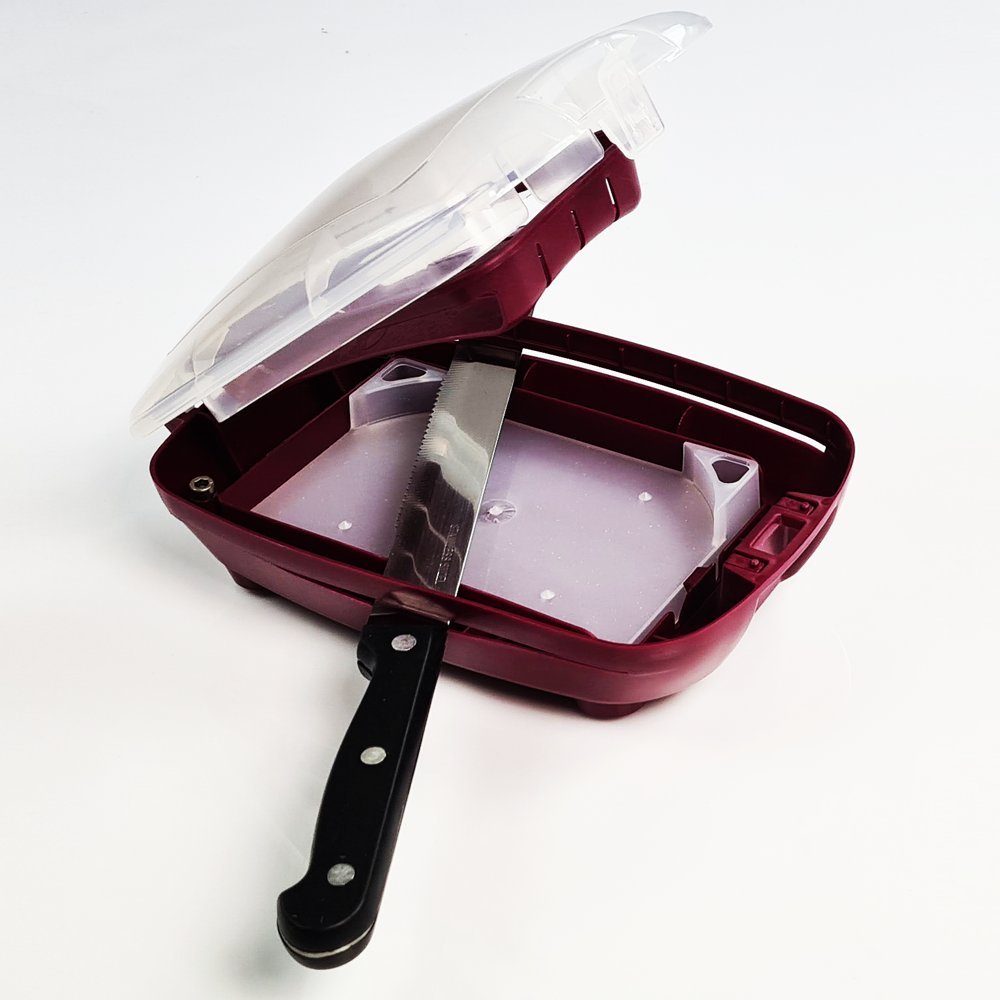 Bei der Safetycrumb Work handelt es sich um eine Schneidebox, die bei der Anwendung einen perfekten Arbeitsschutz bietet und ist optimal geeignet für alle, die viele Brötchen/Brote, etc. schneiden müssen (z. B. Bäckereien, Bistros, Kantinen, Hotels, Restaurants oder einfach für zu Hause). Die Box ist mit Saugnäpfen ausgestattet und sorgt somit für einen festen Stand. Damit sollen Verletzungen vermieden werden, zudem soll das Schneiden erleichtert werden. Das Messer schneidet nur innerhalb der Box, sodass man sich daran bei geschlossener Box nicht verletzen kann. Das Messer lässt sich nicht herausziehen, bleibt also immer in der Box. Sie brauchen einfach nur das Brötchen einlegen, den Deckel schließen und können dann schneiden.