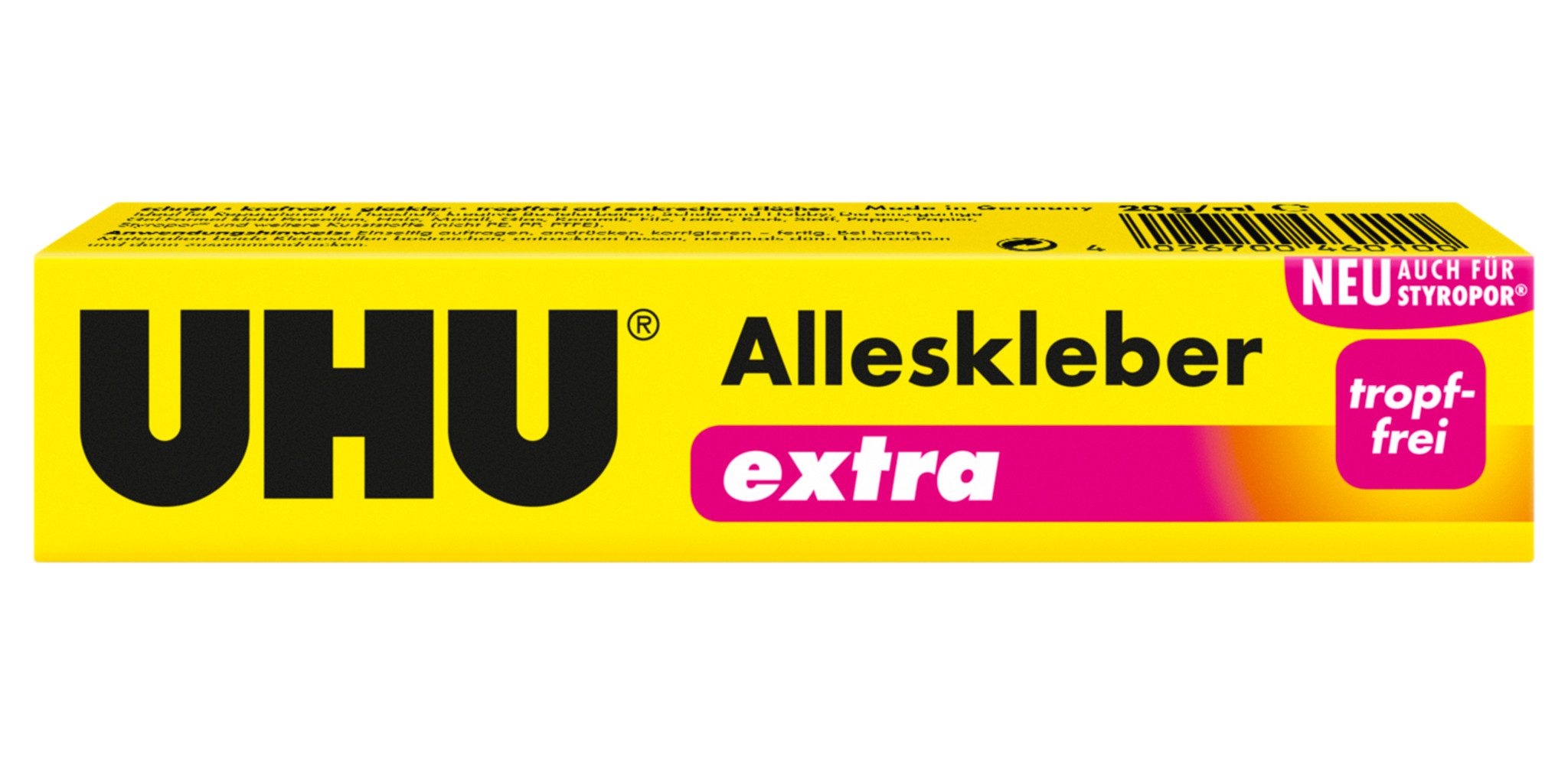 UHU extra Всеskleber ist vielseitig einsetzbar im Haushalt, Schule, Büro oder beim vielen Basteln fleißiger Hobbybastler oder aber auch im Modellbau. Besonders beliebt wegen seinen hervorragenden Eigenschaften beim Kleben von Papier und Pappe. Ein extra starker Kleber, der tropffrei ist und glasklar sauber aufklebt. Er klebt Porzellan, Glas, Metall, Holz, Leder, Stoffe und eben auch Papier und Pappmaché.Inhalt: 20 g.
