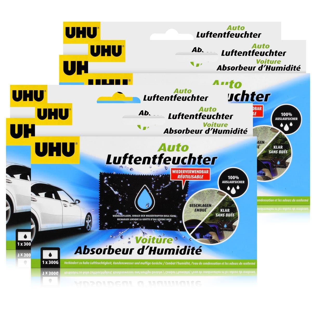 Einfache Anwendung und effektiver Schutz vor FeuchtigkeitDer UHU Auto Luftentfeuchter ist genau das Richtige Mittel gegen Kondenswasser und schlechte Gerüche im Inneren Ihres Fahrzeugs. überschüssige Flüssigkeit wird ganz einfach aus der Luft heraus absorbiert und Feuchtigkeitsschäden werden verhindert, noch bevor sie überhaupt entstehen können. Der UHU Auto Luftentfeuchter sorgt dafür, dass das Autofahren wieder mehr Spaß macht, denn nur saubere Luft ist angenehme Luft. Auch Keimentwicklungen werden durch das praktische Produkt zuverlässig verhindert. Das Produkt ist für Autos, Wohnwagen und Boote geeignet.