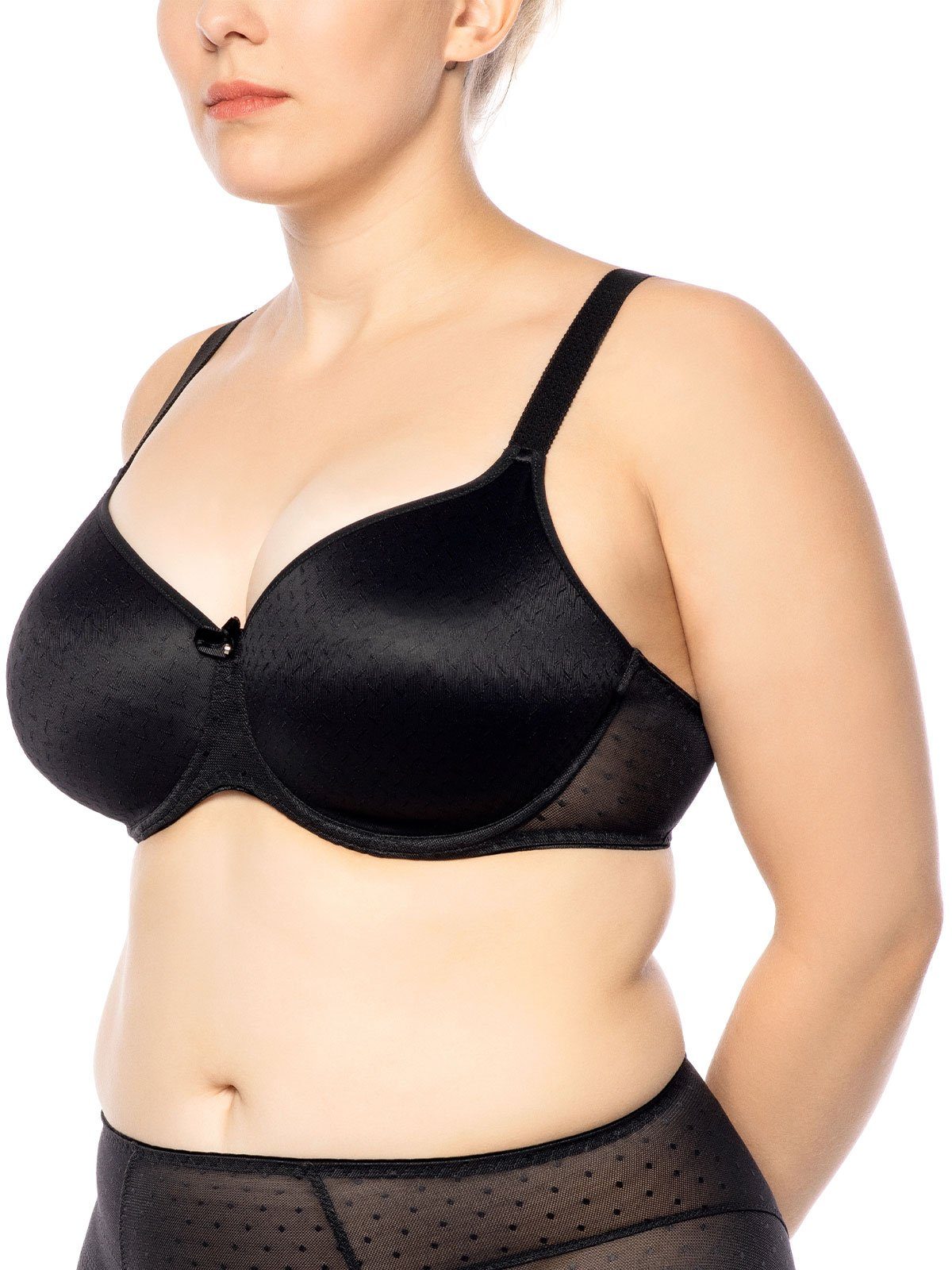 Passt. Hinten 3fach verstellbar mit je 3 Häkchen übereinander. Unter einem engen, weißen T-Shirt zeichnet sich farblich nichts ab. Durch den großen Stoffverbrauch rutscht nichts raus, sieht aber deshalb brustpanzerartig aus und macht kein schönes Dekolleté.