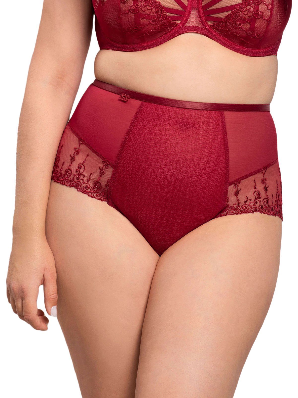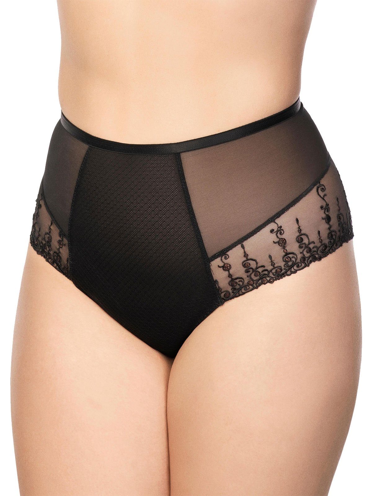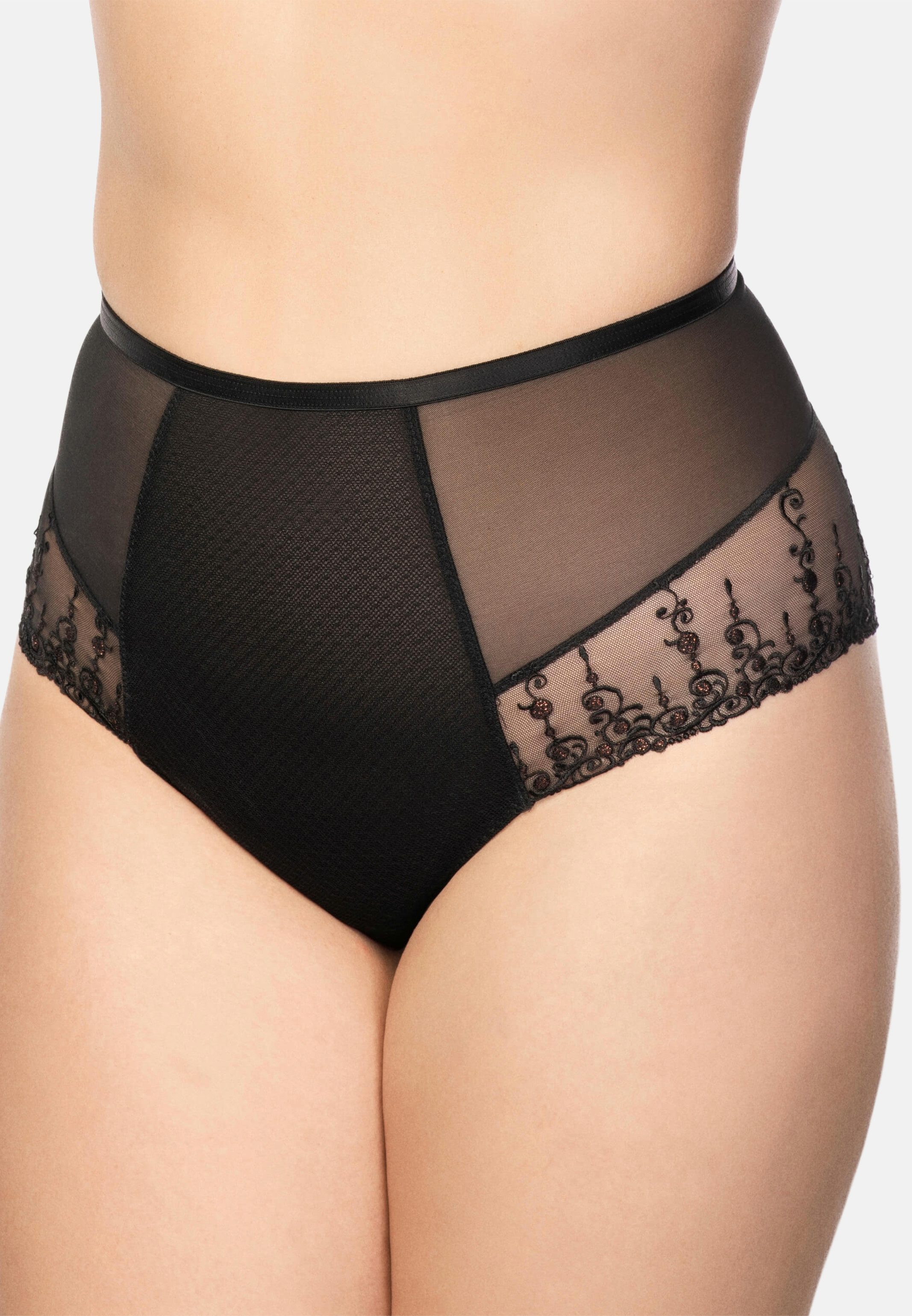 Taillenhoher Slip von der Marke Ulla aus der Serie Exclusive Line. Besondere Merkmale des Artikels sind taillenhohe Schnittform, aus Spitze, vorne mit Tüll verstärkt, stützt den Bauch und figurschmeichelnde Stickerei verläuft nach hinten über den Po. Ulla Dessous produziert Dessous und Bademode mit viel Liebe zum Detail, und verpackt die große Größen Frau verspielt und romantisch in einzigarte und sexy Wohlfühl-Unterwäsche.