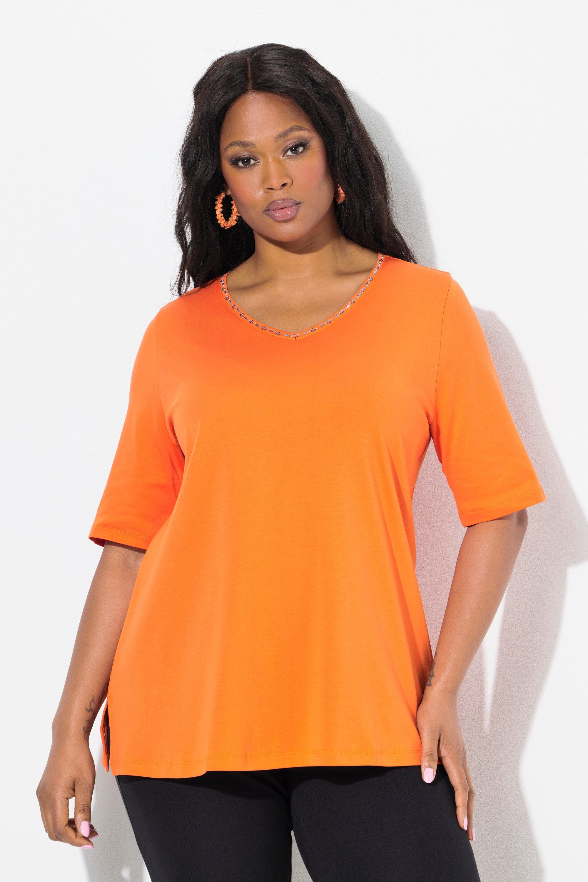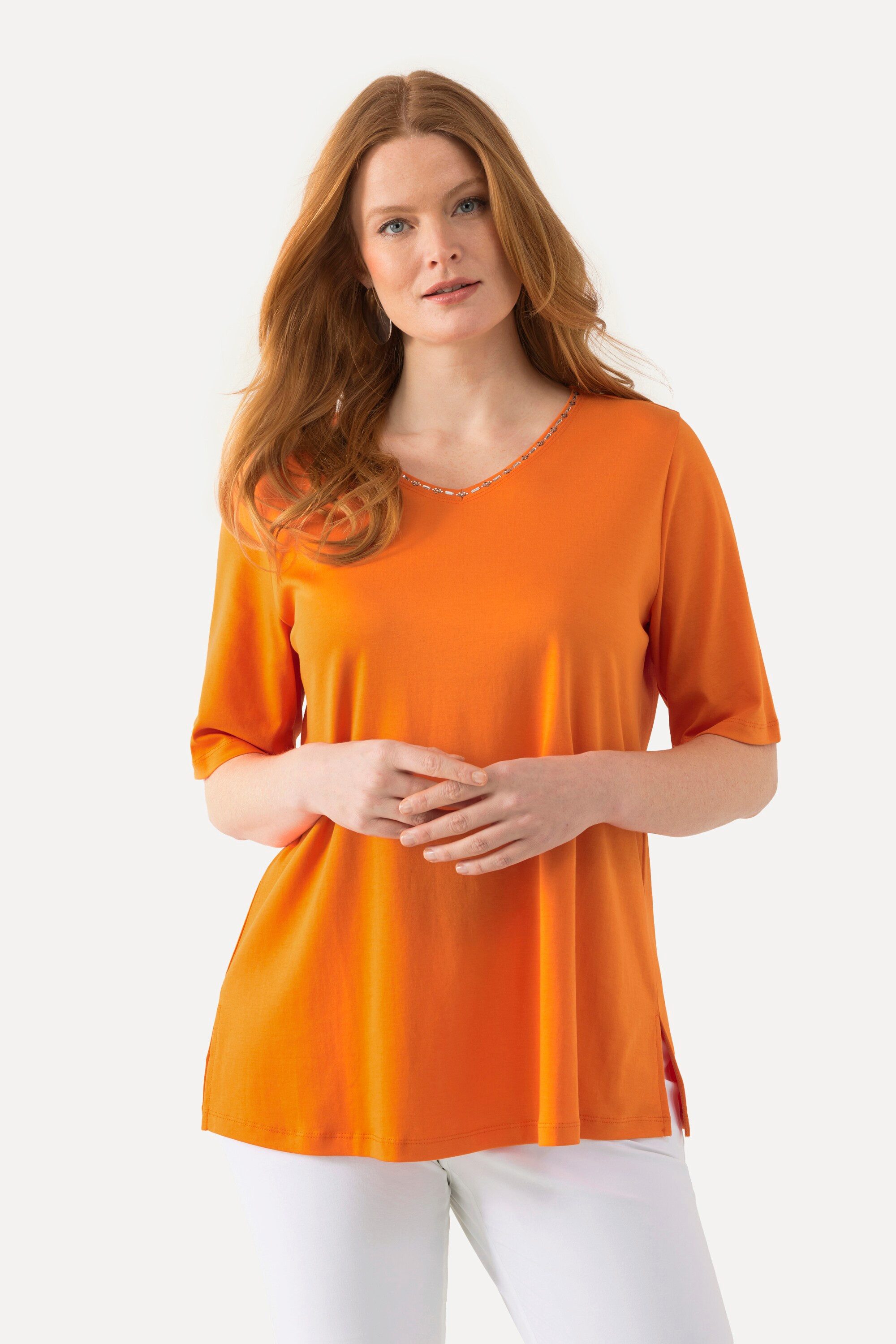 T-Shirt, A-Linie, gefertigt aus hochwertiger, softer Baumwolle. Besonders weiches und hautfreundliches T-Shirt mit edler Glitzerborte am V-Ausschnitt. Langer Halbarm. Größenangepasste Длина ca. 72-76 cm.