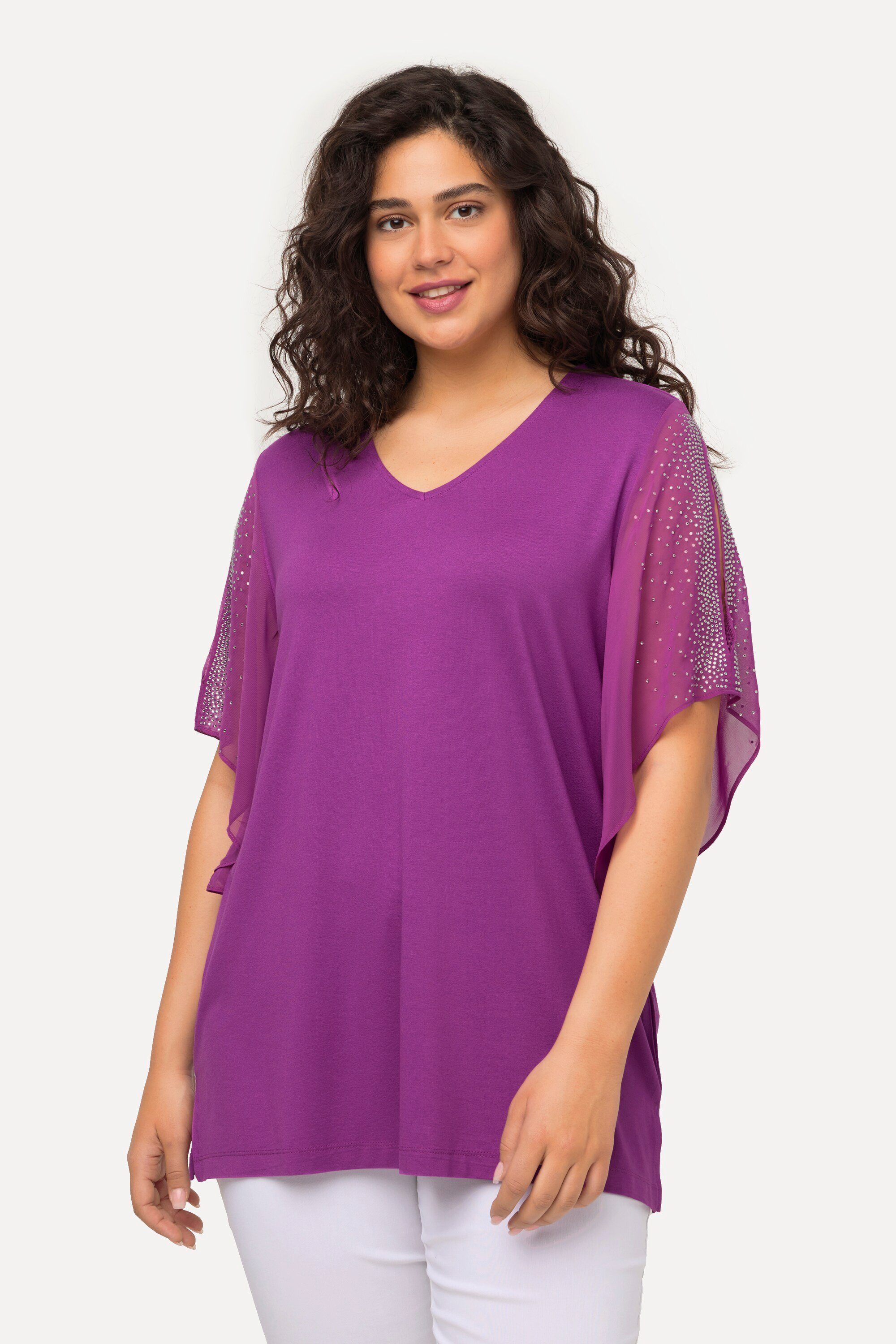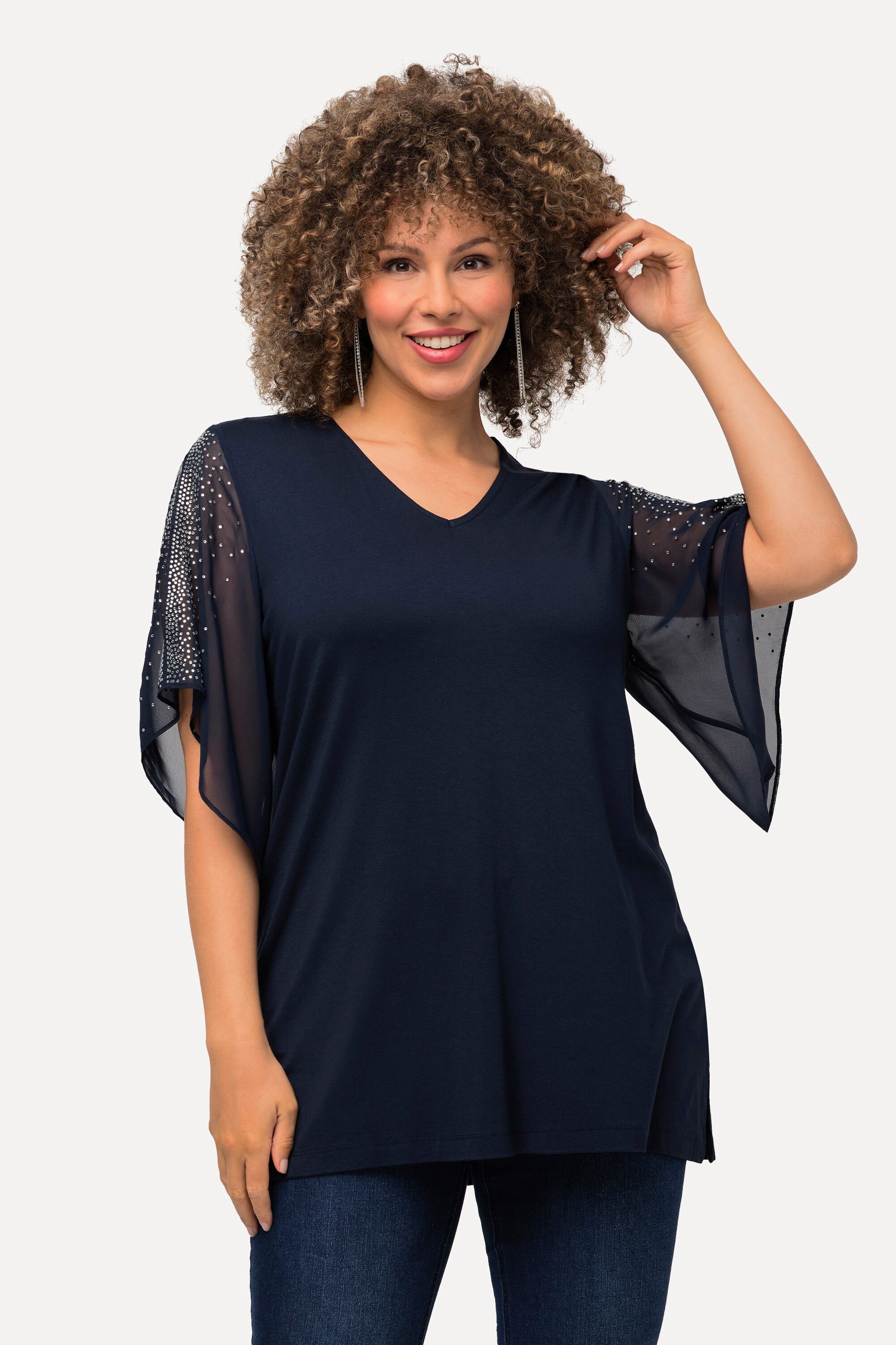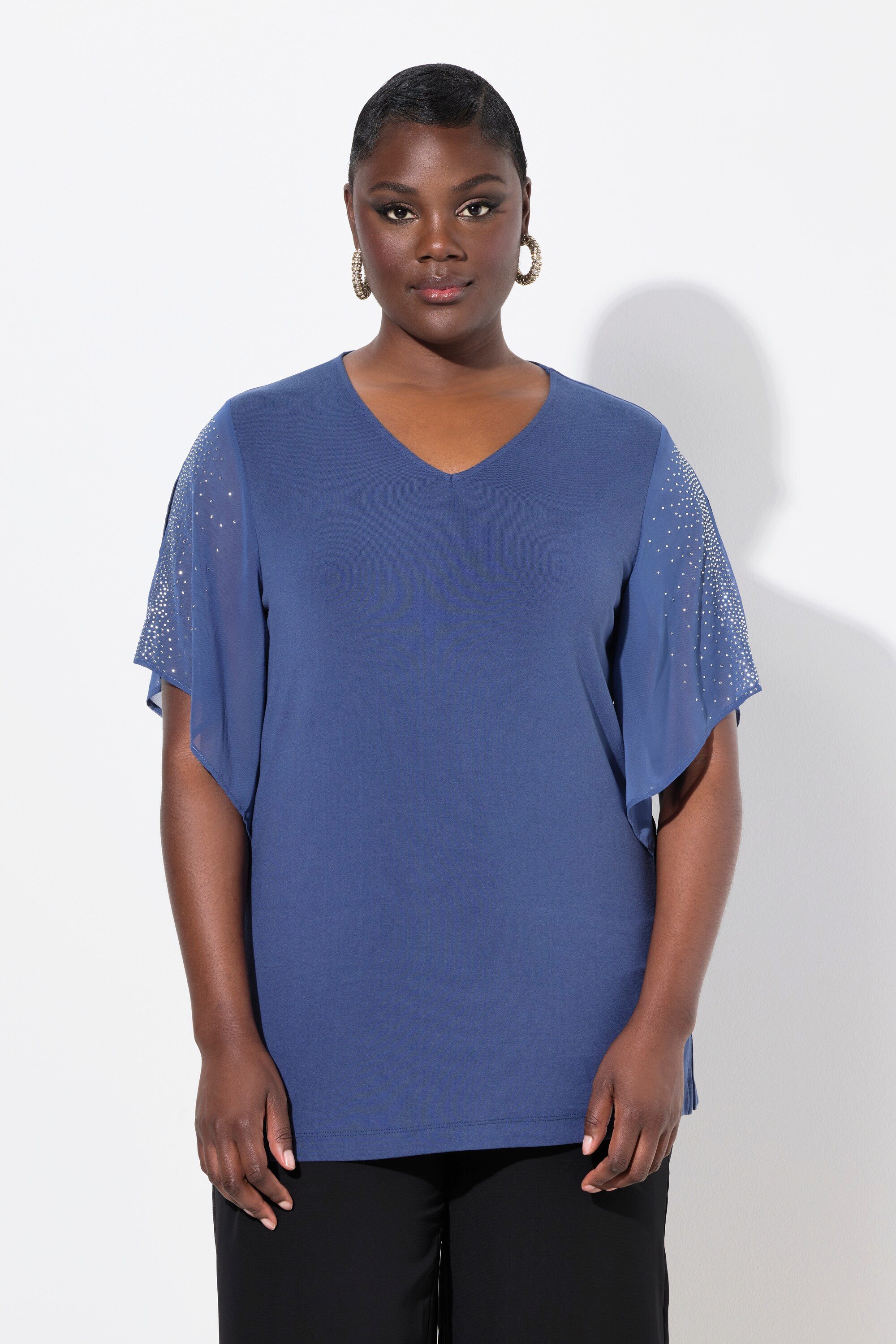 Tunika, A-Line, mit V-Ausschnitt und blickdichtem Top. Transparente 3/4-Ärmel mit Glitzersteinchen und CutOut.