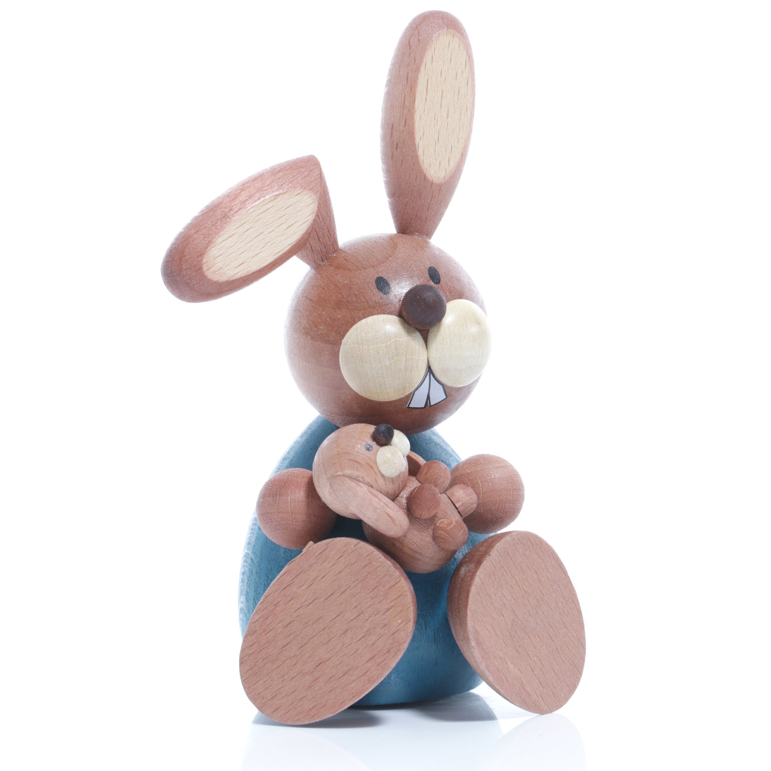 Osterartikel Osterhase mit Kind Dieser schöne Osterhase hat eine Höhe von 11 cm. Er ist bunt bemalt und braun ist das Fell. Der Hase sitzt und in der Hand hält er ein kleines Hasenkind. Всеs wird in verschiedenen Arbeitsschritten komplett in Seiffen in einem kleinen Familienbetrieb gefertigt Höhe=11cm NEU |