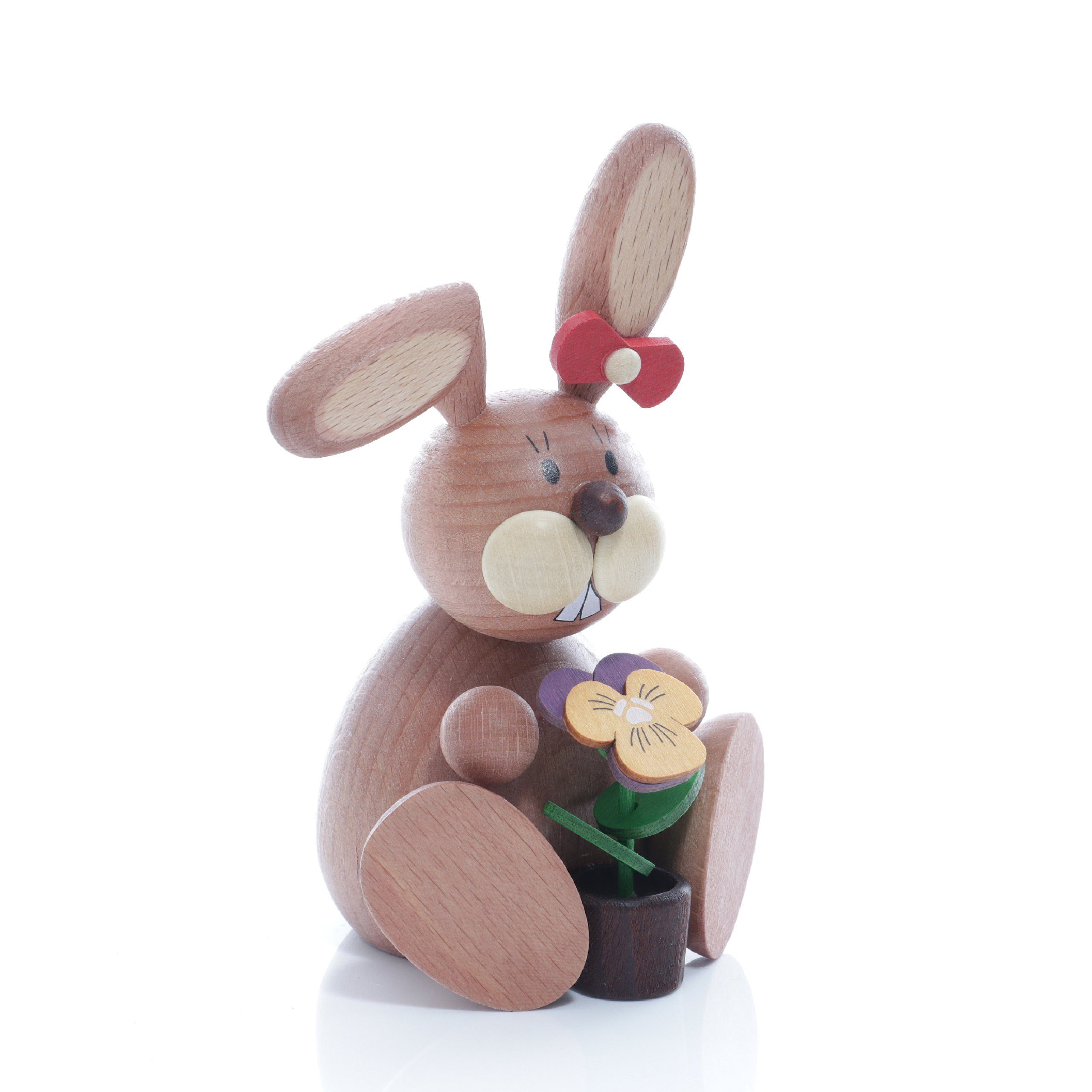 Osterdekoration Osterhäsin mit Blumentopf Diese schöne Osterhäsin hat eine Höhe von 11 cm und ist farbig gestaltet. Sie hat im Ohr eine kleine Schleife und hält in der Hand einen Blumenzopf. Всеs wird in verschiedenen Arbeitsschritten komplett aus Holz in Seiffen gefertigt BxH 6x11cm NEU |