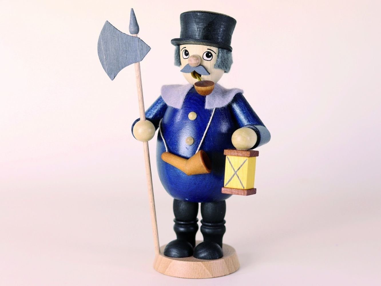 Räuchermann Nachtwächter Der tolle Räuchermann hat eine Размер von 16 cm. Die Figur steht frei und hat eine Funktion für kleine Räucherkerzen. Der Nachtwächter trägt seine Uniform und einen Hut auf dem Kopf. In der Hand hält er seinen Stab. Der Räuchermann ist komplett aus Holz gefertigt und bunt gestaltet. Das Unterteil mit dem Boden läßt sich abnehmen und darauf wird die Räucherkerze gestellt. Всеs wird in verschiedenen Arbeitsschritten komplett in Seiffen in einem Familienbetrieb mit langer Tradition gefertigt HxB 15x8,5cm NEU |