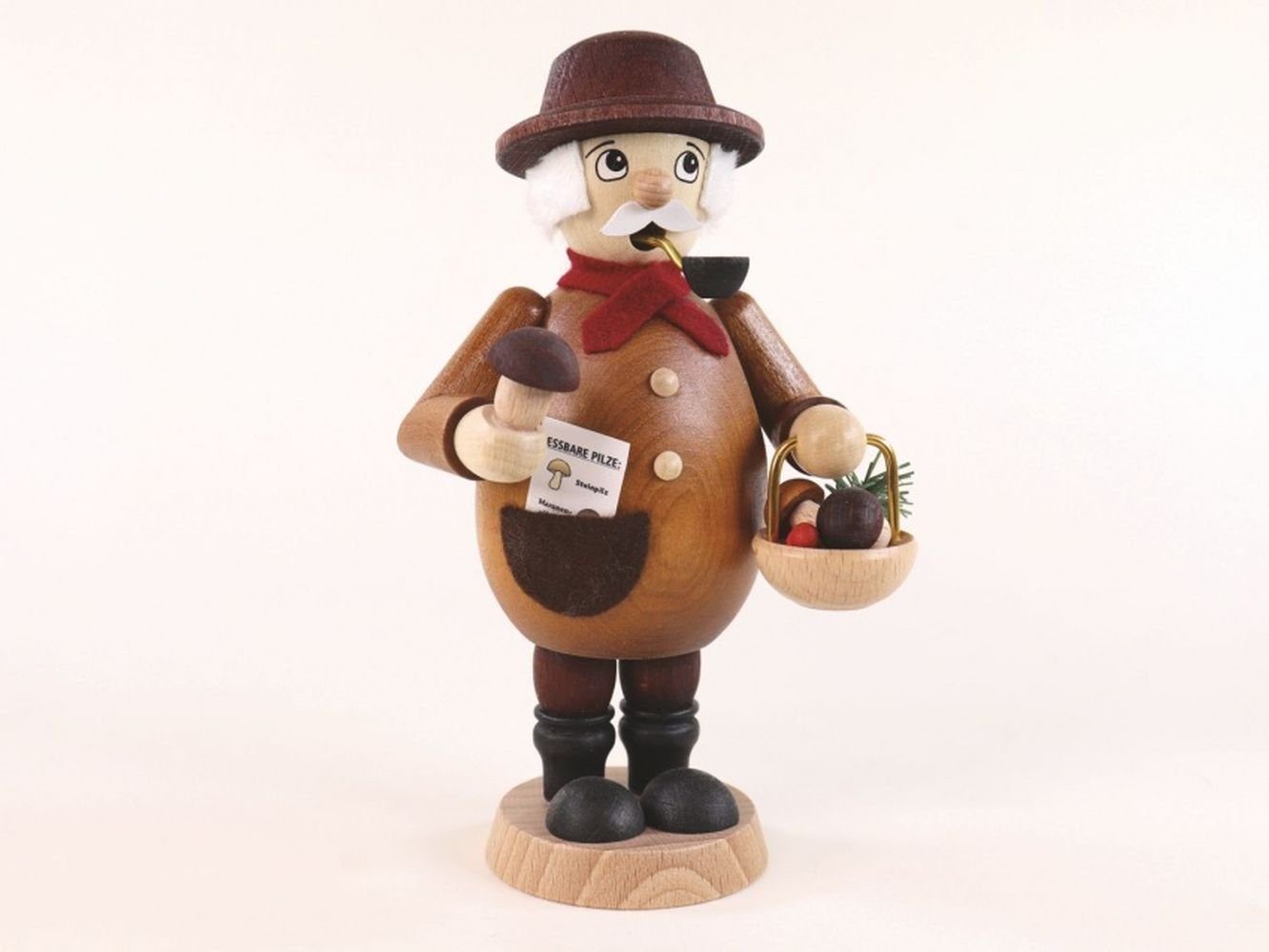 Räuchermann Pilzsammler mit Korb Der tolle Räuchermann hat eine Размер von 15 cm. Die Figur steht frei und hat eine Funktion für kleine Räucherkerzen. Der Pilzsucher trägt eine braune Jacke und einen Hut auf dem Kopf. In der Hand hält er einen Korb mit vielen leckeren Pilzen. Der Räuchermann ist komplett aus Holz gefertigt und bunt gestaltet. Das Unterteil mit dem Boden läßt sich abnehmen und darauf wird die Räucherkerze gestellt. Всеs wird in verschiedenen Arbeitsschritten komplett in Seiffen in einem Familienbetrieb mit langer Tradition gefertigt HxB 15,5x9,5cm NEU |
