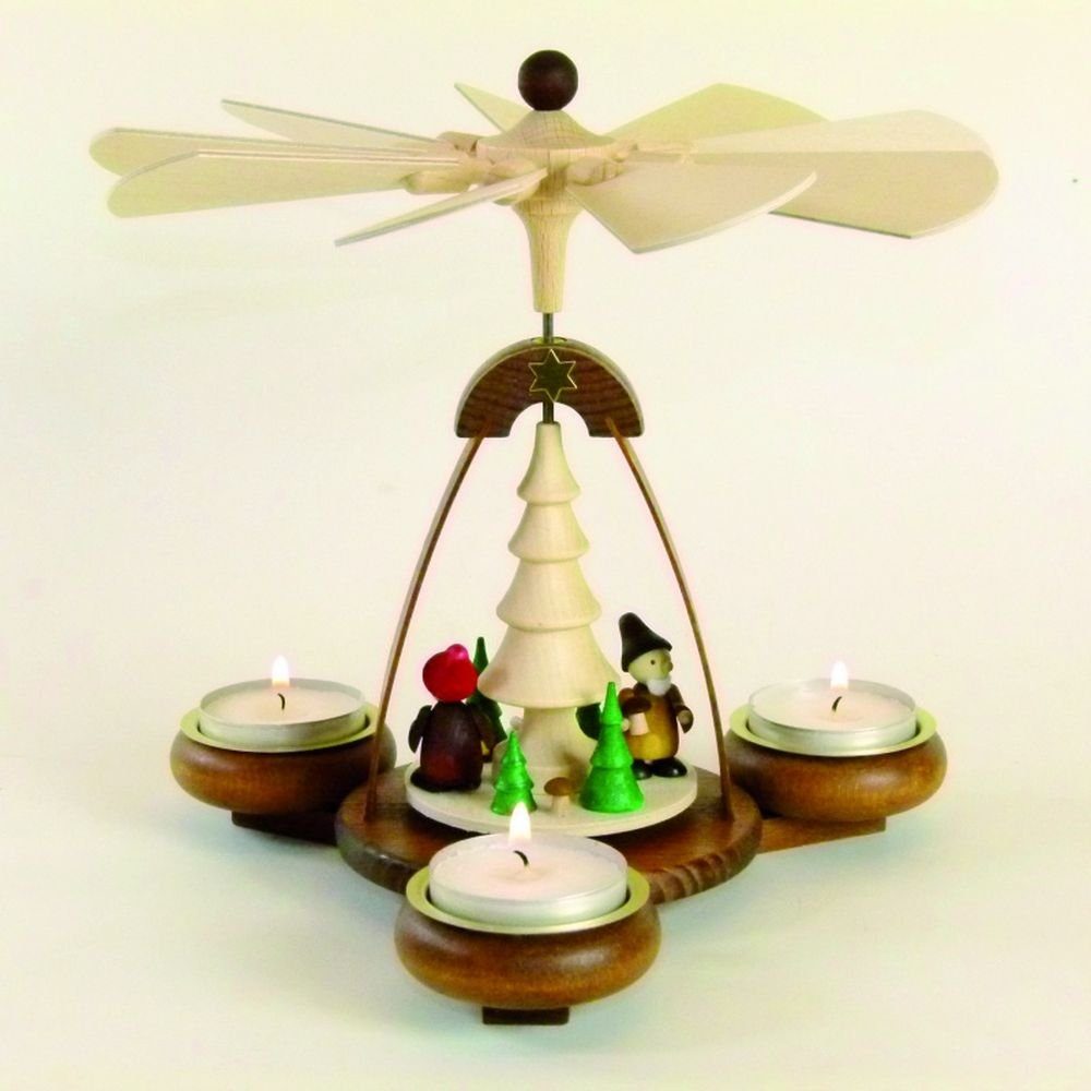 Teelichtpyramide Waldwichtel Mit dieser tollen Pyramide holen Sie sich ein Stück Erzgebirge in Ihre Wohnung. Sie wird in verschiedenen Arbeitsschritten komplett in Seiffen in einem kleinen Familienbetrieb gefertigt. Auf dem Teller der Pyramide drehen sich hübsche kleine Waldwichtel. An 3 Stellen sind Holztüllen mit Messingeinsätzen angebracht für normale Teelichtkerzen. Diese treiben die Pyramide an. Die Pyramide hat eine Höhe von 19 cm. Die Figuren sind bunt und Gestell der Pyramide ist natur gehalten. Teelichter im Lieferumfang nicht enthalten! HxB 19x19,5cm NEU |